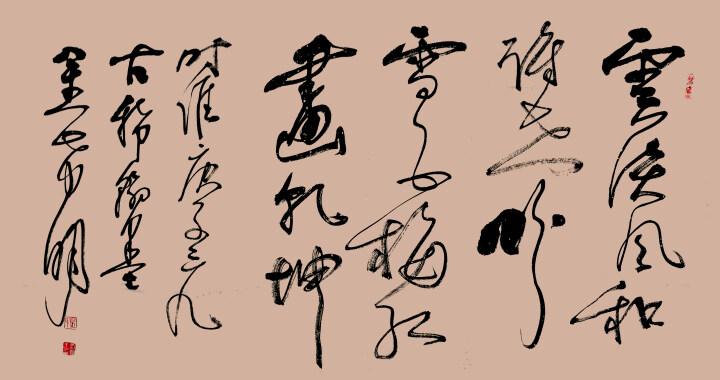 書法要寫得精研、寫得有線條魅力,用筆是關(guān)鍵。善用筆者如順?biāo)写?,須臾可過萬重山。不善用筆者如淺攤劃船,運不得一漿!觀金希明先生的書法作品,盡有用筆嫻熟,毫無滯礙的灑脫,左右擺拔,上下翻飛,絕然是心手互師勢轉(zhuǎn)奇,詭形怪狀番合宜的爐火純青。筆執(zhí)于手,似乎是生發(fā)于心尖,可以意在筆先,常作凌空殺紙的痛快,一筆下來如秋鷹逐兔,力透紙背!這是力作動感的表現(xiàn)力。接續(xù)下一筆,筆纖一轉(zhuǎn),可見狡兔暴駭,將奔未馳!筆里有墨,墨里有筆,可寫意萬類之象,有相合,有相隨,有沖突,有相激!書法寫出了無限變化的戲劇情景,所以每一件作品都充滿著惟妙惟肖的靈動!唯有象金希明先生這樣寫草書,才可以讓草書之淵妙,代不絕人。