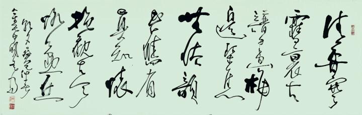 文人書道,古今相續(xù)。金先生的草書,八面出鋒,雖然令人琢磨不定,但絕不寫粗頭亂服的江湖體,而是法度嚴(yán)謹(jǐn)?shù)木珰馍?!筆墨不失格,精益求精,必是書法創(chuàng)作與傳承的正宗!也正是基于此,讓金先生的書法極有專業(yè)的影響力,也有審美的號召力,他是書法是以狂繼癲之后,書法龍脈的大道傳承!凡草圣,盡皆如是?。ㄖ麜嬙u論家 史峰)