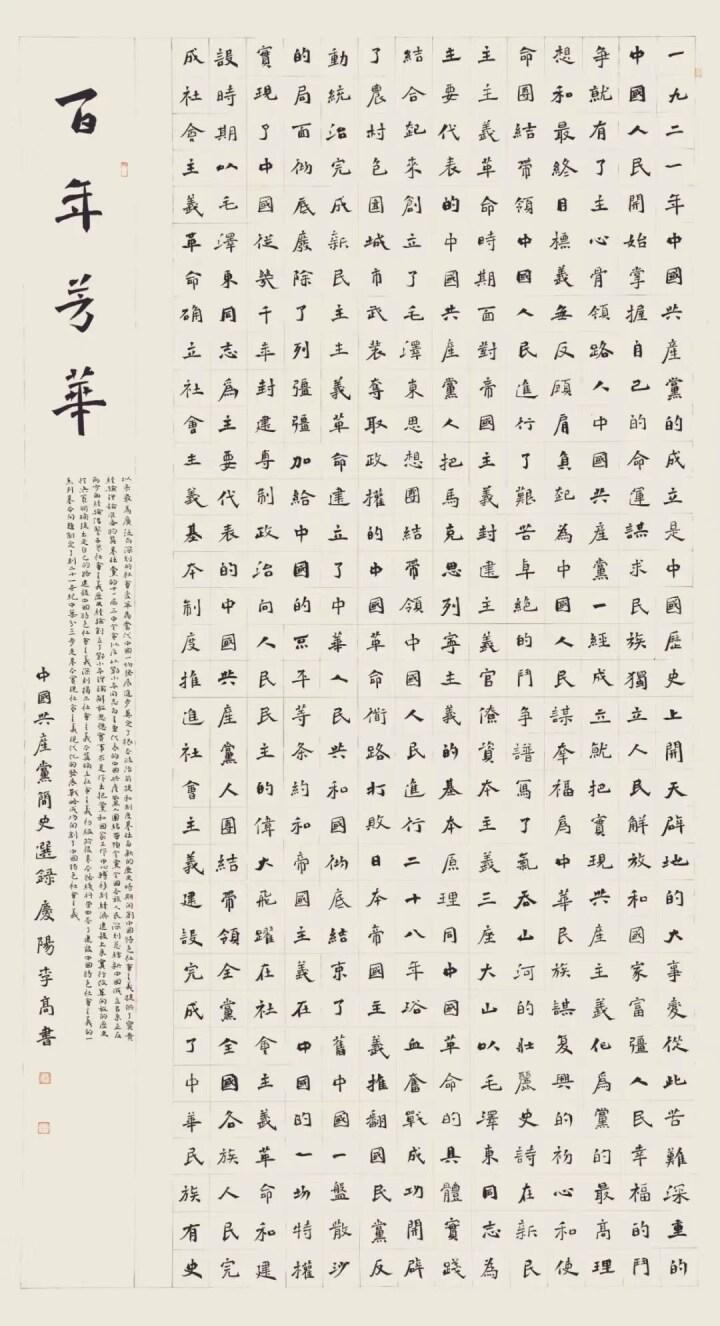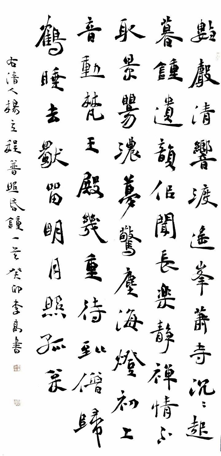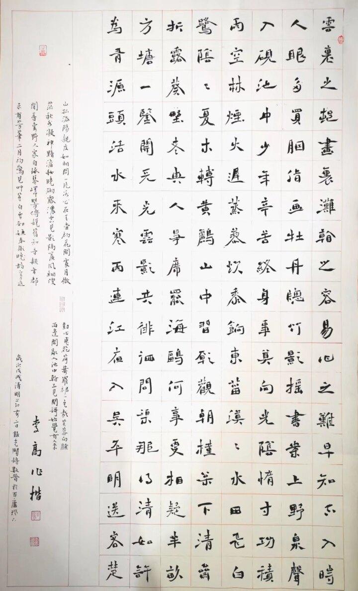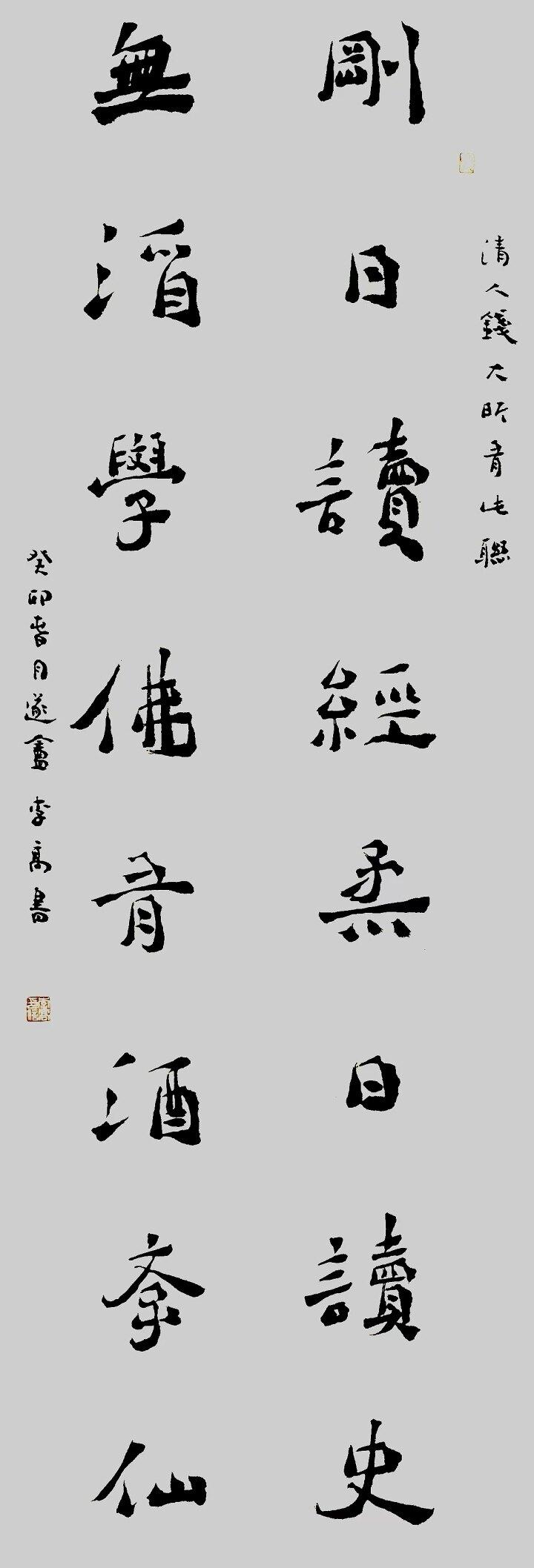 李高是一個(gè)善于學(xué)習(xí)的人,在大學(xué)期間,他利用節(jié)假日,遠(yuǎn)赴蘭州求教于曹恩東先生,短暫的時(shí)間內(nèi),他在魏碑書法上就取得豐碩的成果。李高的魏碑筆法純正,造型結(jié)字能力很強(qiáng),通過對《張猛龍》、《張黑女》等碑的臨習(xí),他的方筆得到了強(qiáng)化,創(chuàng)作能力也日漸增長。為了不斷打開創(chuàng)作視野,增加作品營養(yǎng)成分,他又對褚遂良的《大字陰符經(jīng)》、《雁塔圣教序》下了一番功夫,藉此,用筆的靈動(dòng)之感明顯得到提升。在此基礎(chǔ)上,李高深入的研習(xí)魏晉楷書和“二王”行書,行書筆法中的提按頓挫慢慢地可以運(yùn)用到魏碑的創(chuàng)作中了。這些積淀,使李高的書法分化出了兩種面目,一種是風(fēng)格強(qiáng)烈的碑式魏碑書法,一種是行書筆法魏碑結(jié)構(gòu)的帖式魏碑書法。在碑式魏碑書法中,他從“二爨”中得到啟發(fā),將撇捺壓低,改變了傳統(tǒng)意義上的“舒展”,弱化了魏碑的撇捺,強(qiáng)化了縱式效果。帖式的魏碑書法,大概是其深受國展書風(fēng)的影響,自然形成的東西,不過李高并沒有完全照搬,他只是憑借著這種理念,自覺地揉入行書筆法,同時(shí),還對個(gè)體的大小、輕重進(jìn)行了自我組合,其創(chuàng)作的含金量不可小覷。