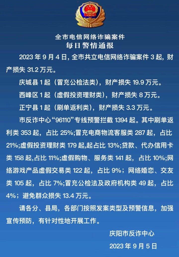 【法治慶陽】立案3起,財產(chǎn)損失31.2萬元!慶陽市發(fā)布9月4日電信網(wǎng)絡(luò)詐騙案件警情通報