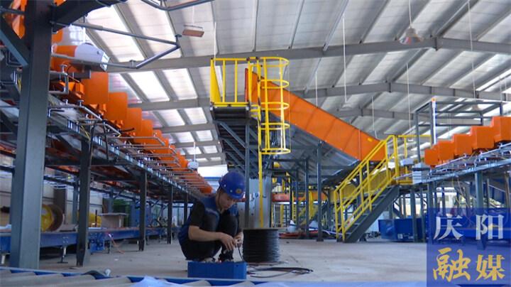 ▲在西峰區(qū)寄遞公共配送中心,工作人員正在安裝自動化快遞分揀線。