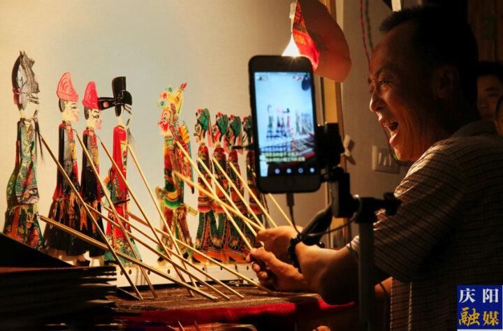 2018年8月31日,環(huán)縣道情皮影藝人在演出時(shí)通過快手直播。通訊員 耿改琴 攝