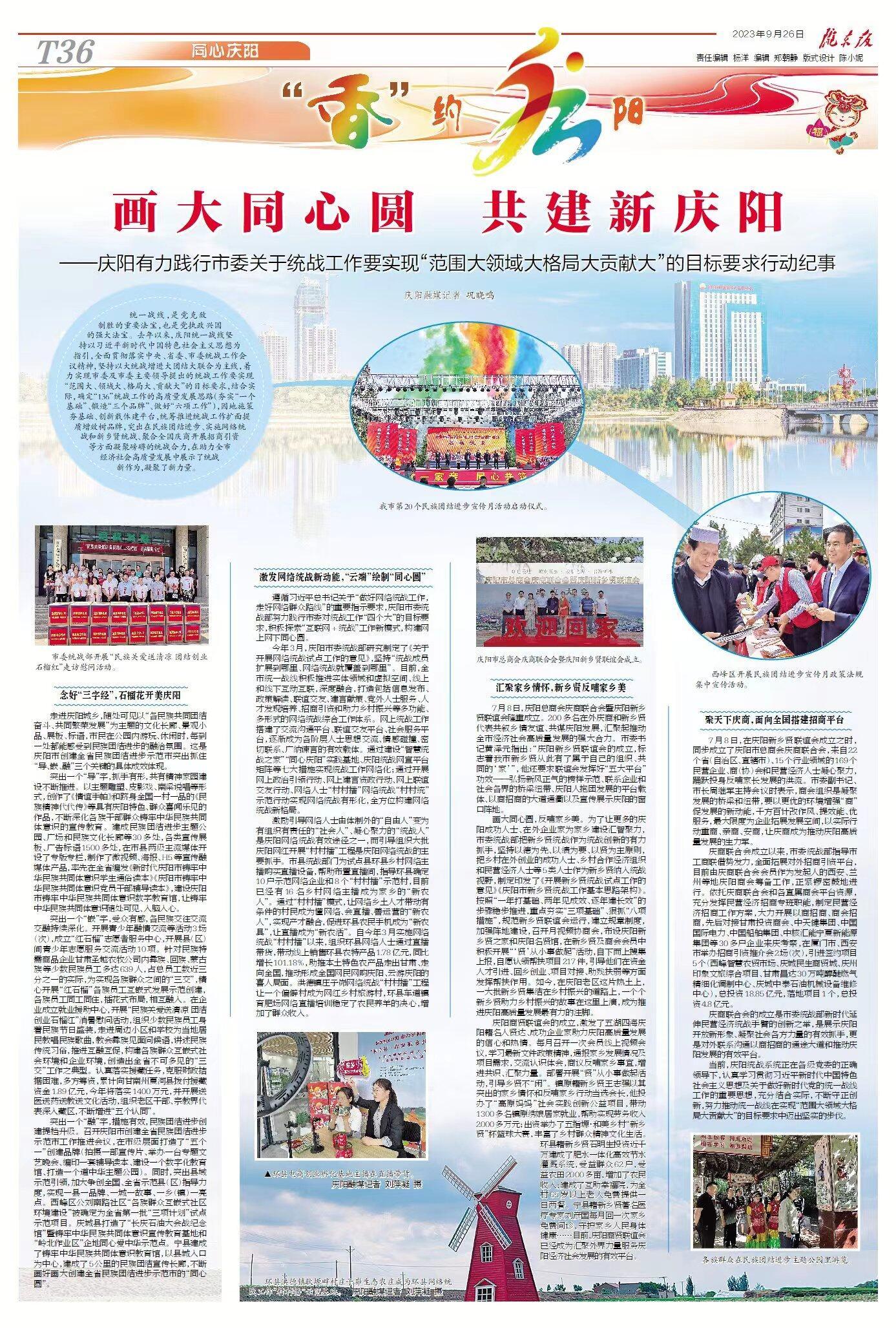 慶陽網(wǎng)訊(慶陽融媒記者 鞏曉鳴)統(tǒng)一戰(zhàn)線,是黨克敵制勝的重要法寶,也是黨執(zhí)政興國的強大法寶。去年以來,慶陽統(tǒng)一戰(zhàn)線堅持以習(xí)近平新時代中國特色社會主義思想為指引,全面貫徹落實中央、省委、市委統(tǒng)戰(zhàn)工作會議精神,堅持以大統(tǒng)戰(zhàn)增進大團結(jié)大聯(lián)合為主線,著力實現(xiàn)市委及市委主要領(lǐng)導(dǎo)提出的統(tǒng)戰(zhàn)工作要實現(xiàn)“范圍大、領(lǐng)域大、格局大、貢獻大”的目標要求,結(jié)合實際,確定“136”統(tǒng)戰(zhàn)工作的高質(zhì)量發(fā)展思路(夯實“一個基礎(chǔ)”、鍛造“三個品牌”、做好“六項工作”),因地施策夯基礎(chǔ)、創(chuàng)新載體建平臺,統(tǒng)籌推進統(tǒng)戰(zhàn)工作擴面提質(zhì)增效樹品牌,突出在民族團結(jié)進步、實施網(wǎng)絡(luò)統(tǒng)戰(zhàn)和新鄉(xiāng)賢統(tǒng)戰(zhàn)、聚合全國慶商開展招商引資等方面凝聚磅礴的統(tǒng)戰(zhàn)合力,在助力全市經(jīng)濟社會高質(zhì)量發(fā)展中展示了統(tǒng)戰(zhàn)新作為,凝聚了新力量。