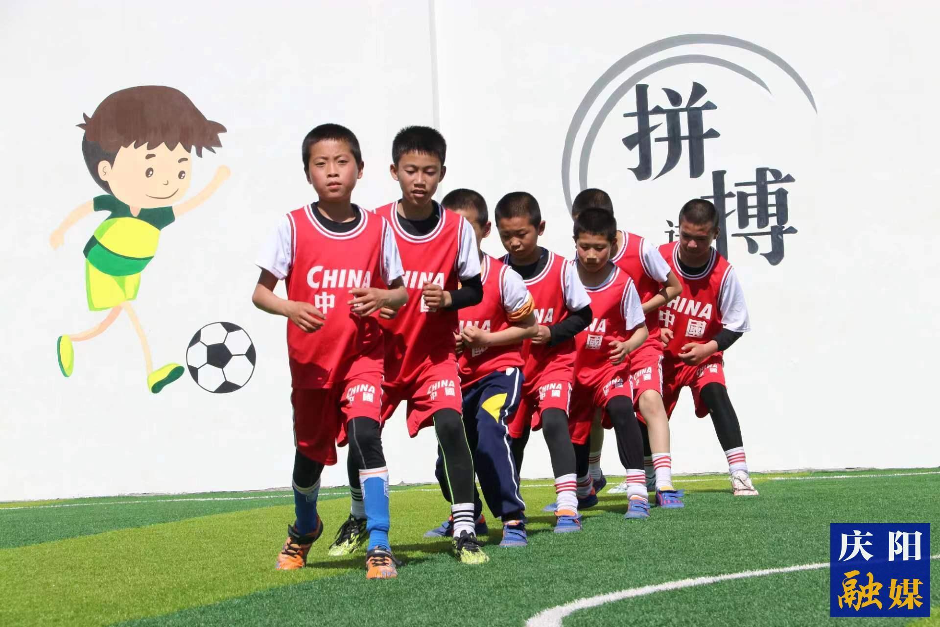 西峰區(qū)彭原鎮(zhèn)趙溝畎小學(xué)學(xué)生進(jìn)行足球訓(xùn)練。