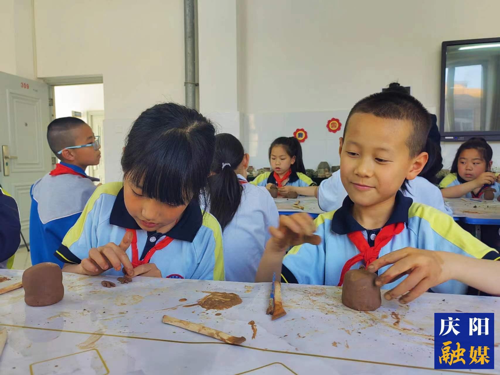 西峰區(qū)新建小學(xué)的學(xué)生在老師的指導(dǎo)下進(jìn)行泥塑創(chuàng)作。