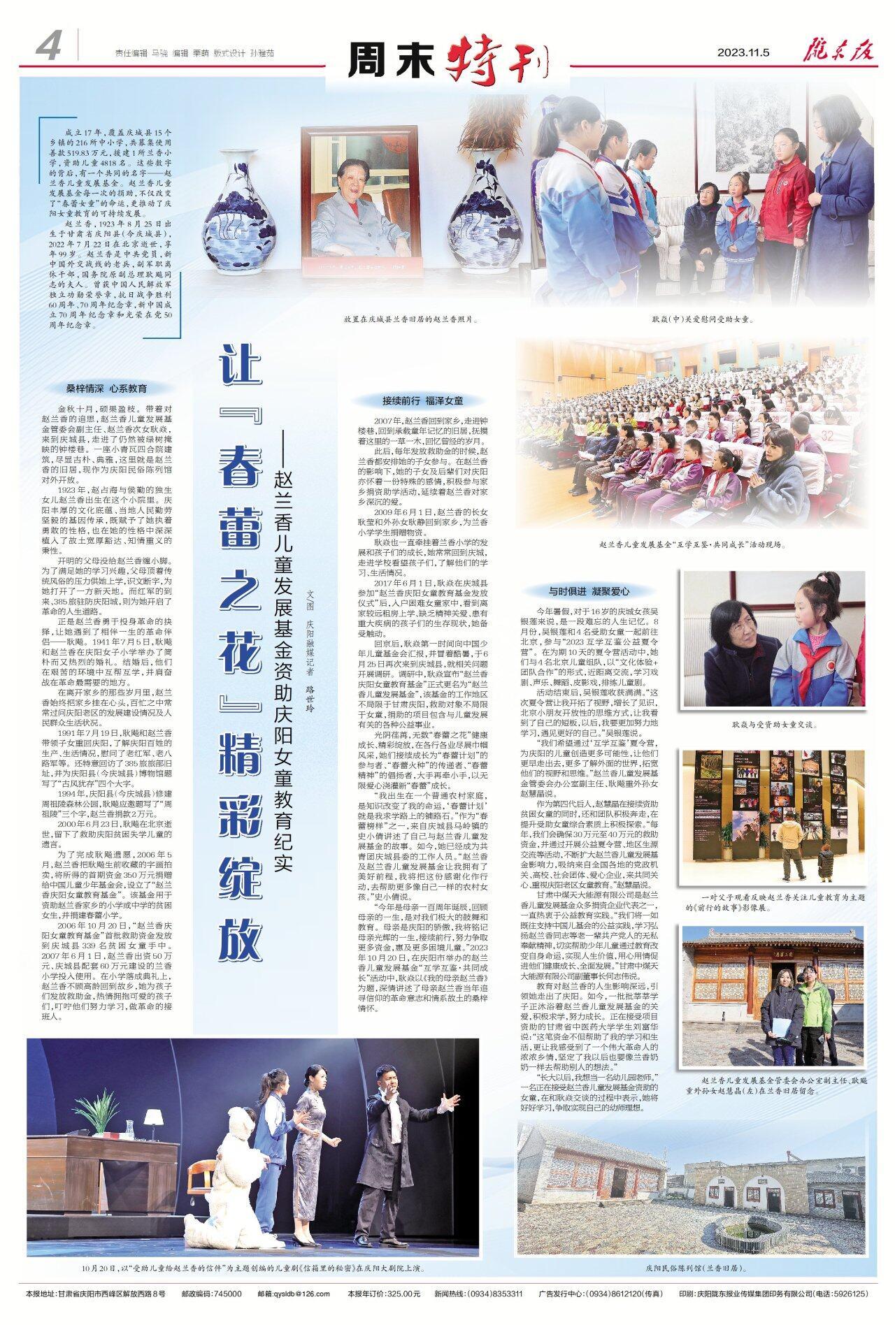 慶陽網(wǎng)訊(慶陽融媒記者 路世玲)成立17年,覆蓋慶城縣15個(gè)鄉(xiāng)鎮(zhèn)的216所中小學(xué),共募集使用善款519.83萬元,援建1所蘭香小學(xué),資助兒童4818名。這些數(shù)字的背后,有一個(gè)共同的名字——趙蘭香兒童發(fā)展基金。趙蘭香兒童發(fā)展基金每一次的捐助,不僅改變了“春蕾女童”的命運(yùn),更推動(dòng)了慶陽女童教育的可持續(xù)發(fā)展。
