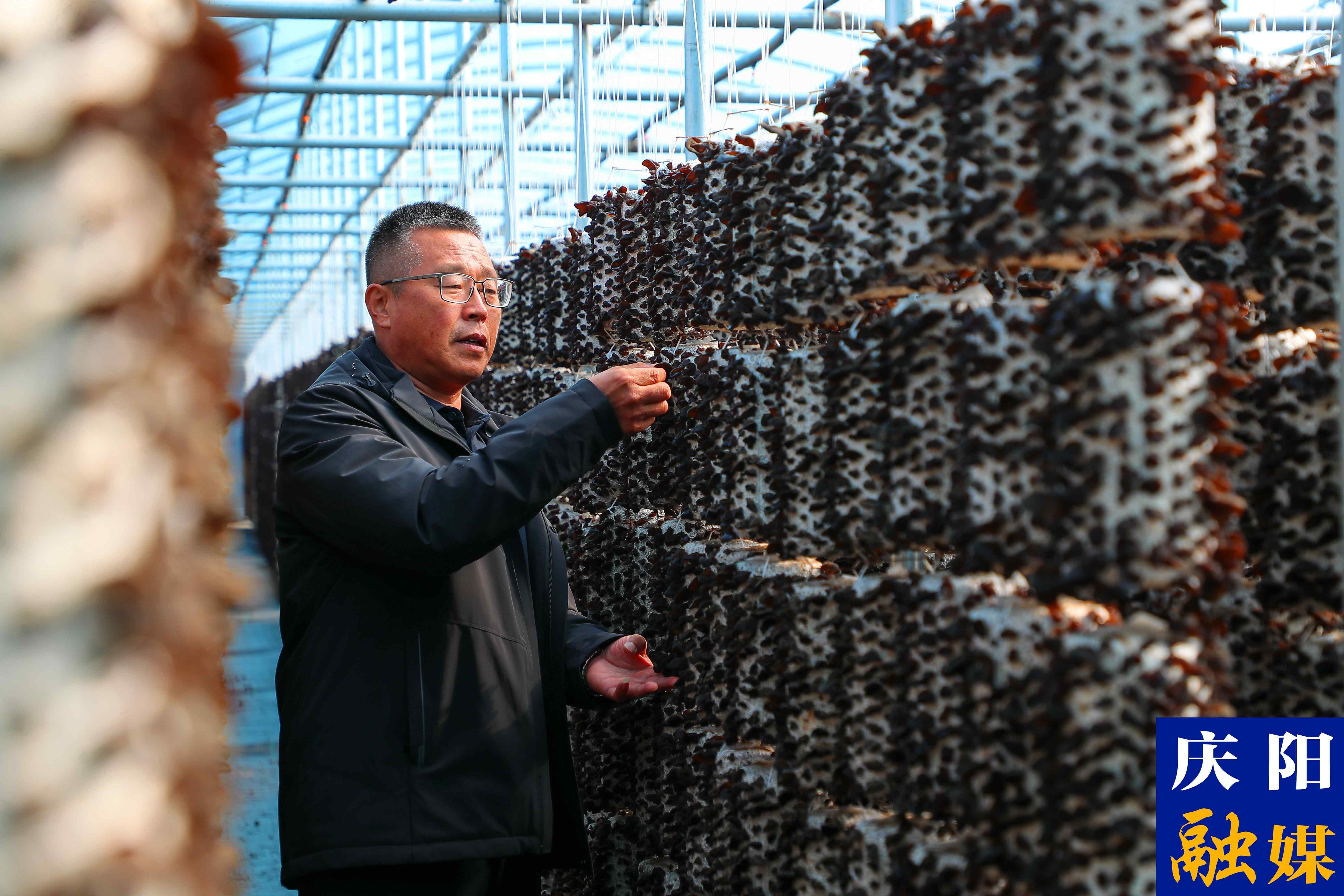 西峰區(qū)彭原鎮(zhèn)食用菌種植基地內(nèi),工人正在查看黑木耳生長情況。陳飛攝