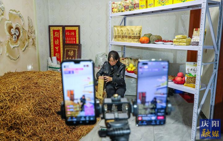 鎮(zhèn)原縣廟渠鎮(zhèn)文夏村村民通過(guò)網(wǎng)絡(luò)直播售賣自家農(nóng)產(chǎn)品。