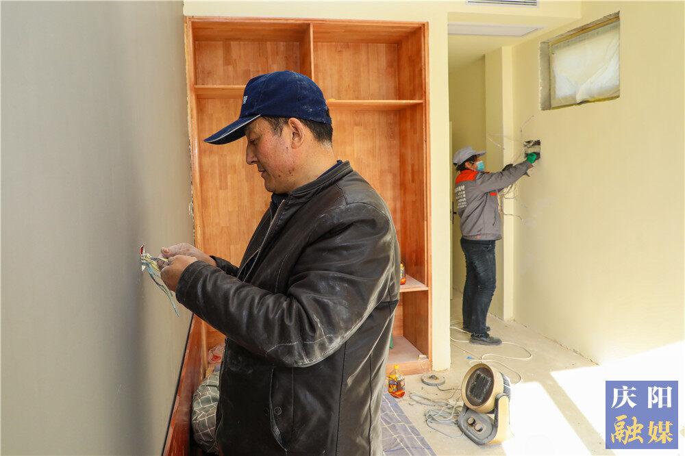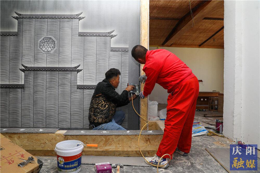 工人在民宿館內(nèi)裝修施工。