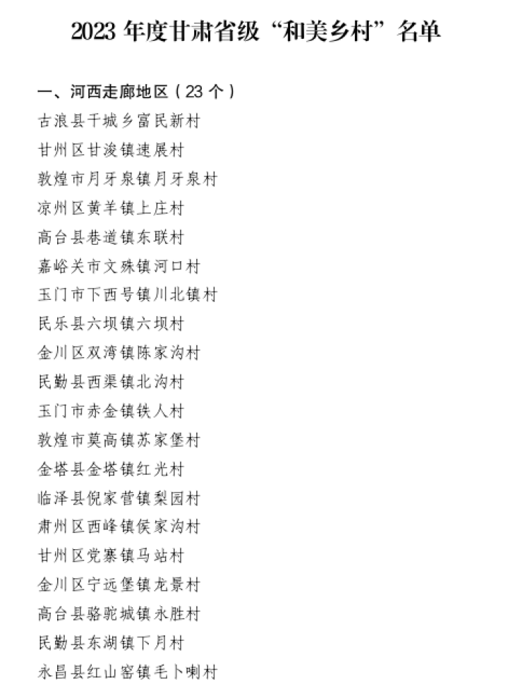 按照省委辦公廳、省政府辦公廳《甘肅省“和美鄉(xiāng)村”創(chuàng)建行動實施方案》和省委農(nóng)辦《甘肅省“和美鄉(xiāng)村”示范創(chuàng)建標準(2023—2025年)》《甘肅省“和美鄉(xiāng)村”評審認定實施辦法(試行)》等文件精神,在全省14個市州和蘭州新區(qū)自愿申報的基礎上,組織評審答辯,擬認定古浪縣干城鄉(xiāng)富民新村等94個行政村為2023年度甘肅省省級“和美鄉(xiāng)村”,現(xiàn)將名單進行公示,聽取社會意見,接受社會監(jiān)督。
