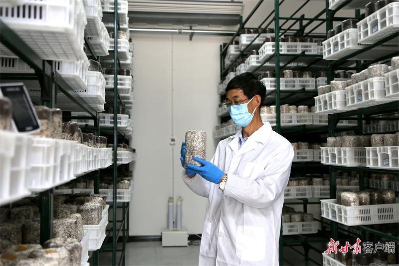 西峰區(qū)后官寨鎮(zhèn)食用菌基地科技人員檢查香菇菌種長(zhǎng)勢(shì)。