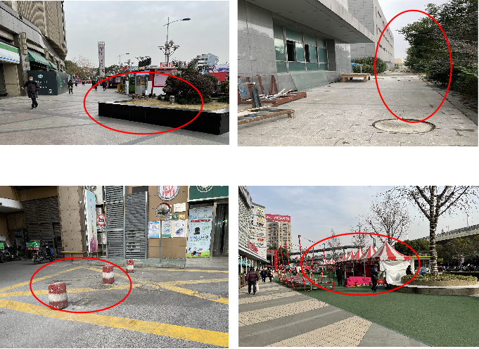 常見問題:消防車道上設(shè)置景觀花壇、臨時建(構(gòu))筑物、樹木、架空管線等障礙物,固定隔離樁、停車泊位或臨時展臺、特賣場所等,影響消防車輛通行。