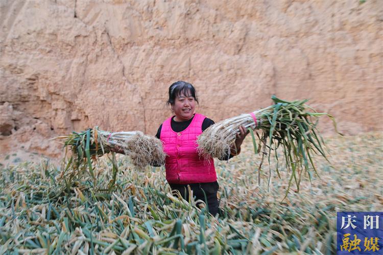 ▲宮河鎮(zhèn)彭姚川村村民彭會軍的妻子展示自家栽植的大蔥。