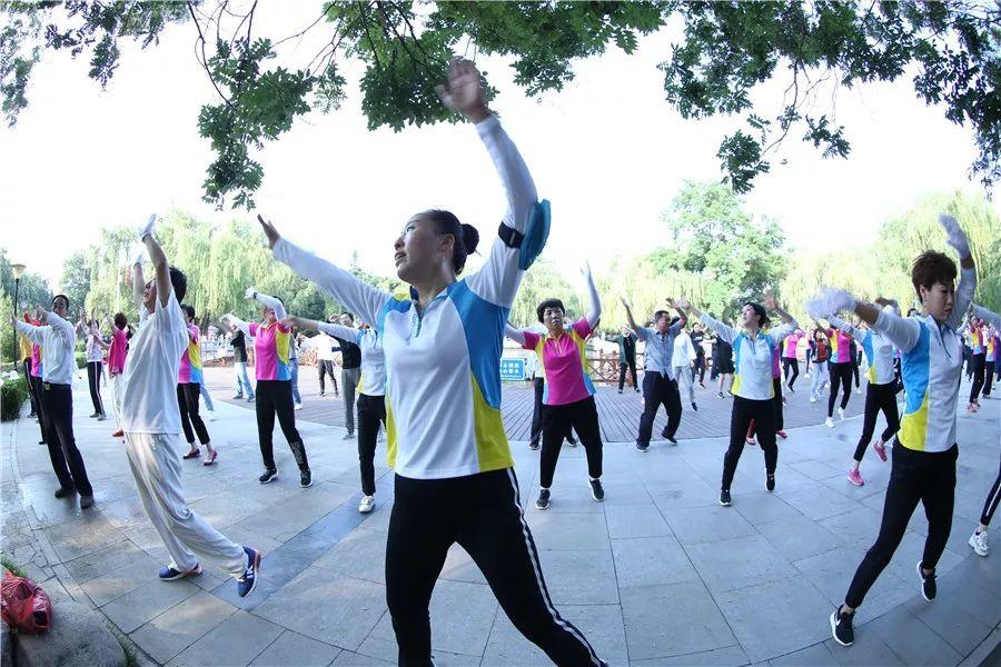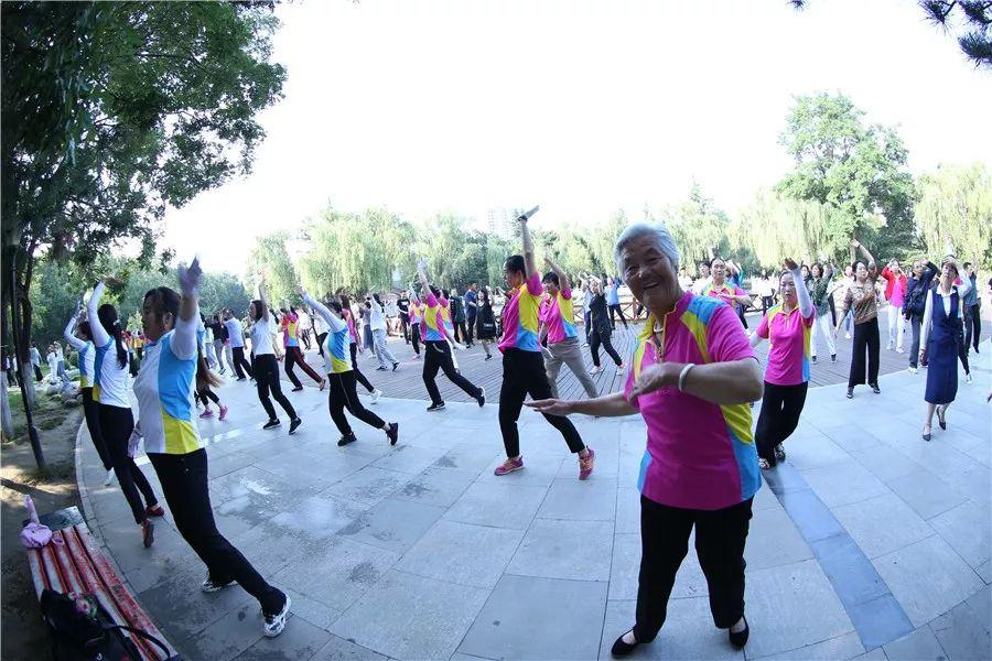 人們跳著廣場舞,練太極劍。