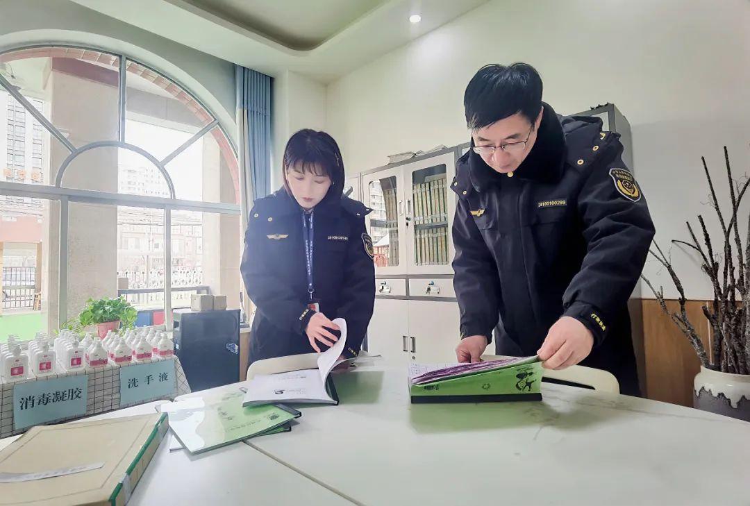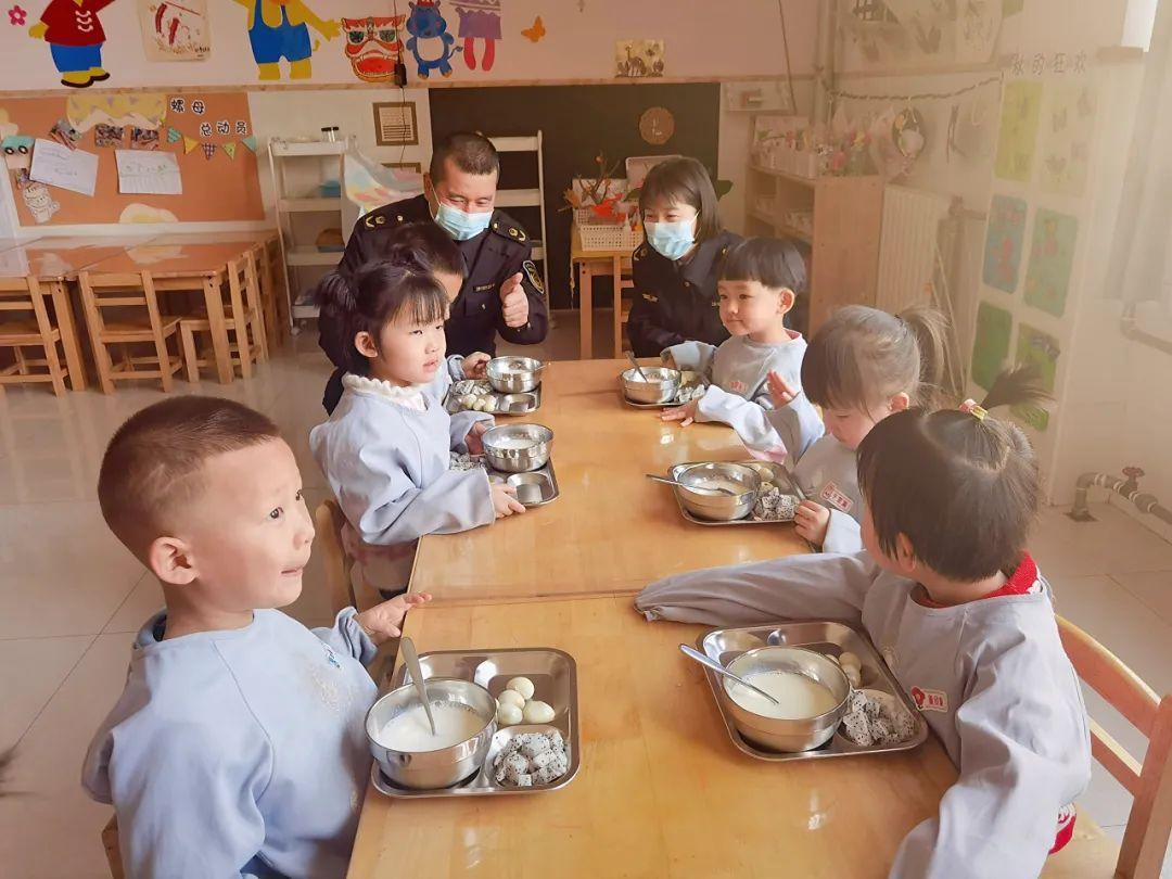 西峰區(qū)蘭州路市場(chǎng)監(jiān)督管理所執(zhí)法人員在秦霸嶺幼兒園檢查食品安全。