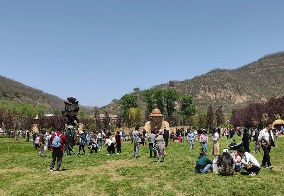 游客在義渠國故里景區(qū)玩賞稻草人