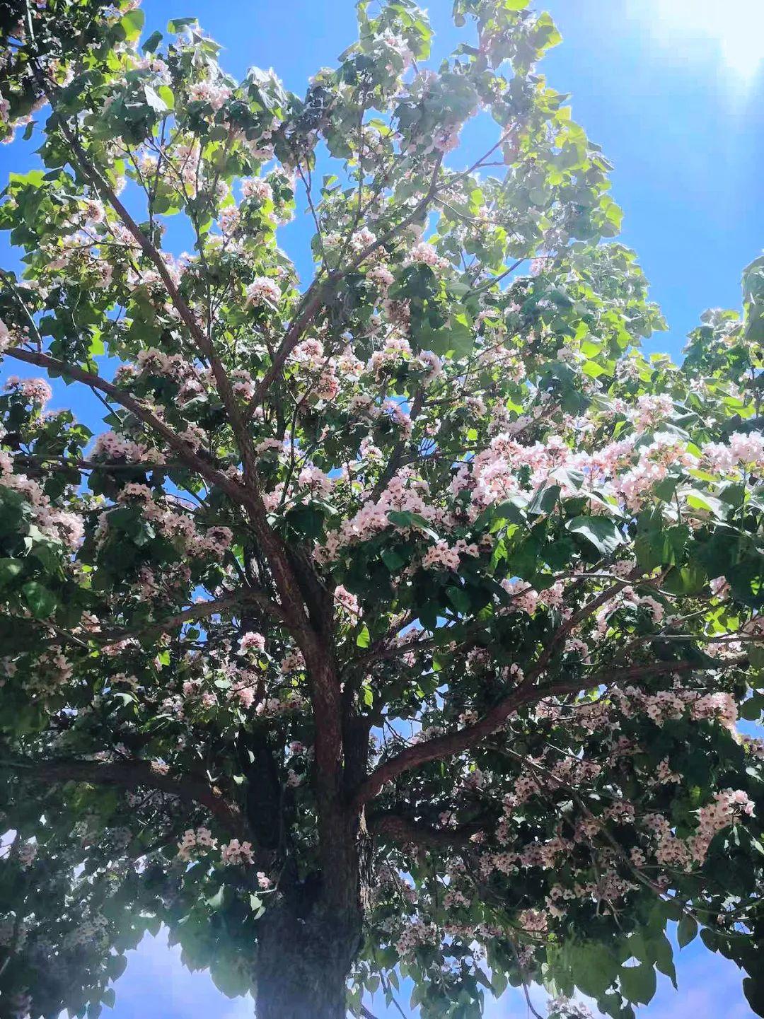 四月是鮮花盛開的日子,大地是花的舞臺,各類鮮花紛紛亮相,展現(xiàn)出她們獨(dú)特的色彩,不一樣的形狀,別致的香味,演繹著她們或者短暫或長久的綻放歲月。好多花都是一晃而過,最早的迎春花、杏花、桃花、油菜花、櫻花等等,她們依次綻放,短短幾天,她們又隨著時(shí)間飄落成泥。春花易逝,盛開的日子總是很短,一陣風(fēng),一陣雨,一樹鮮花就隕落了,好多花會孕育出幼小的果實(shí),有些花兒來去匆匆,幾天的時(shí)間,就會香消玉損?,F(xiàn)在,到了四月末,五月即將來臨,花季已經(jīng)接近夏季,在春季最后的舞臺上,楸樹開花了。