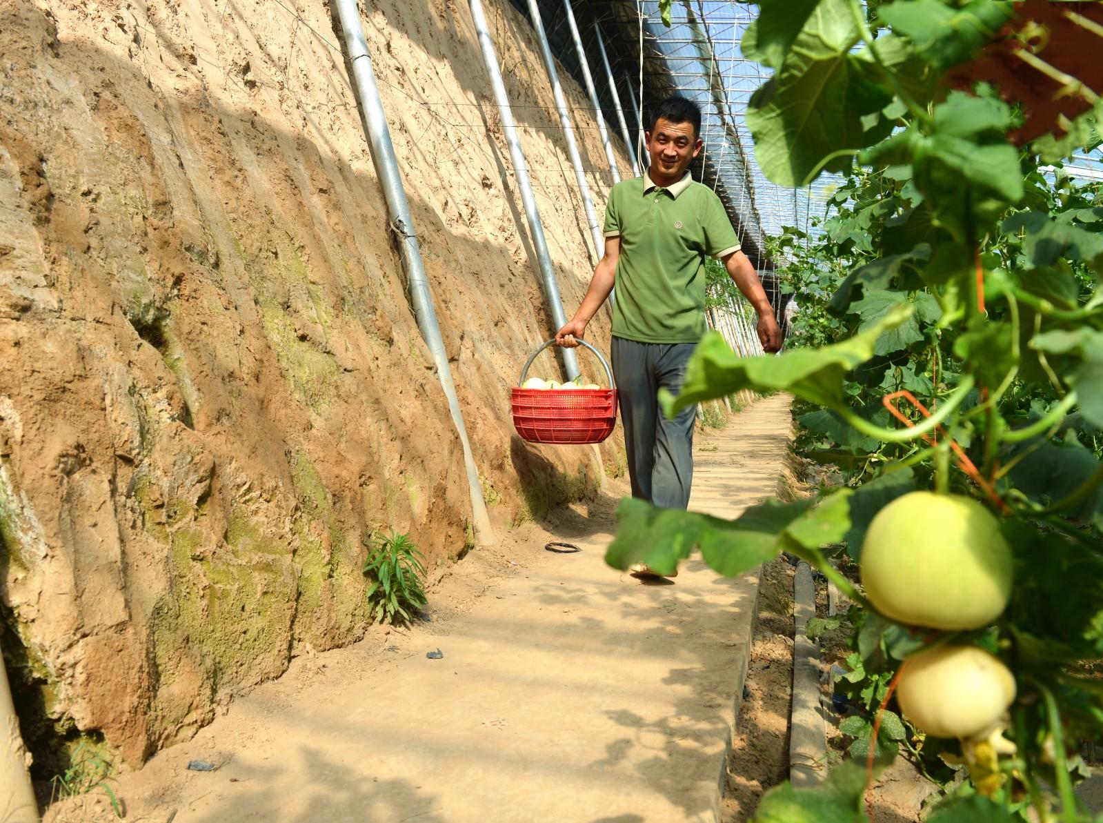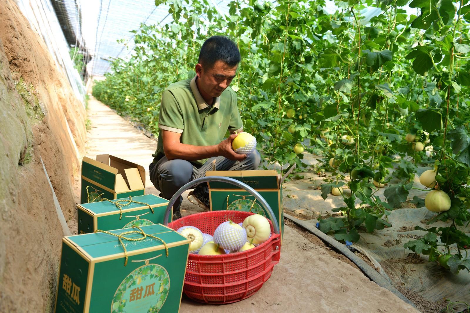 寧縣北川甜瓜種植戶王濤在采摘甜瓜。 慶陽(yáng)融媒記者 李建強(qiáng) 攝