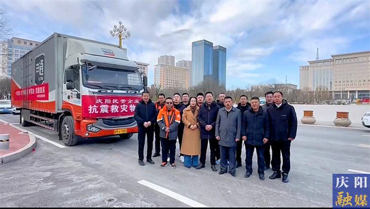 ▲慶陽市政協(xié)委員王新(右三)與愛心企業(yè)共同為積石山捐贈物資。