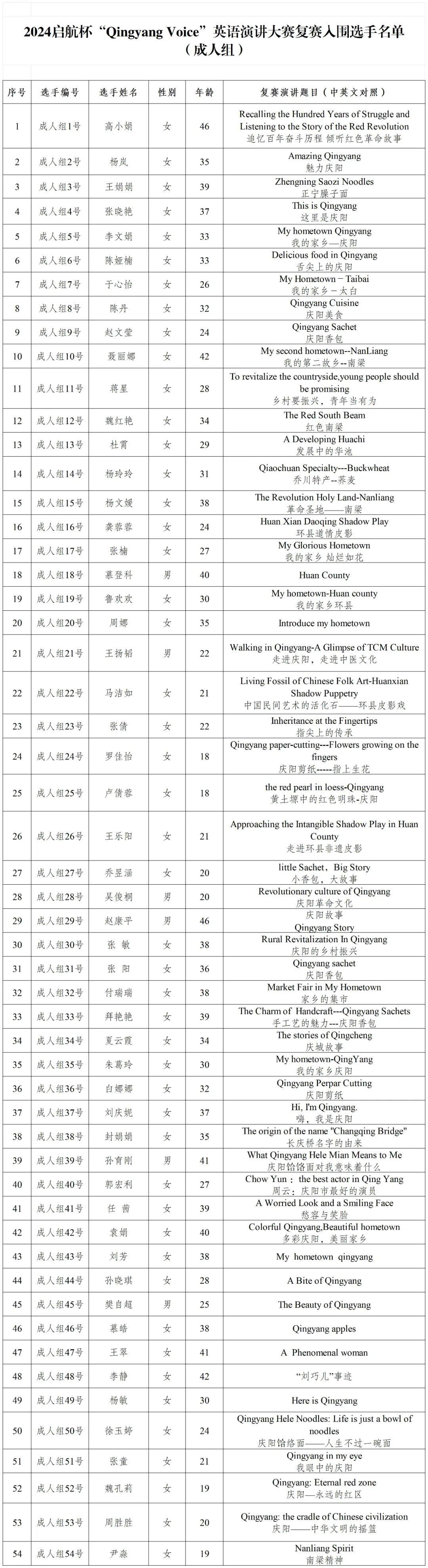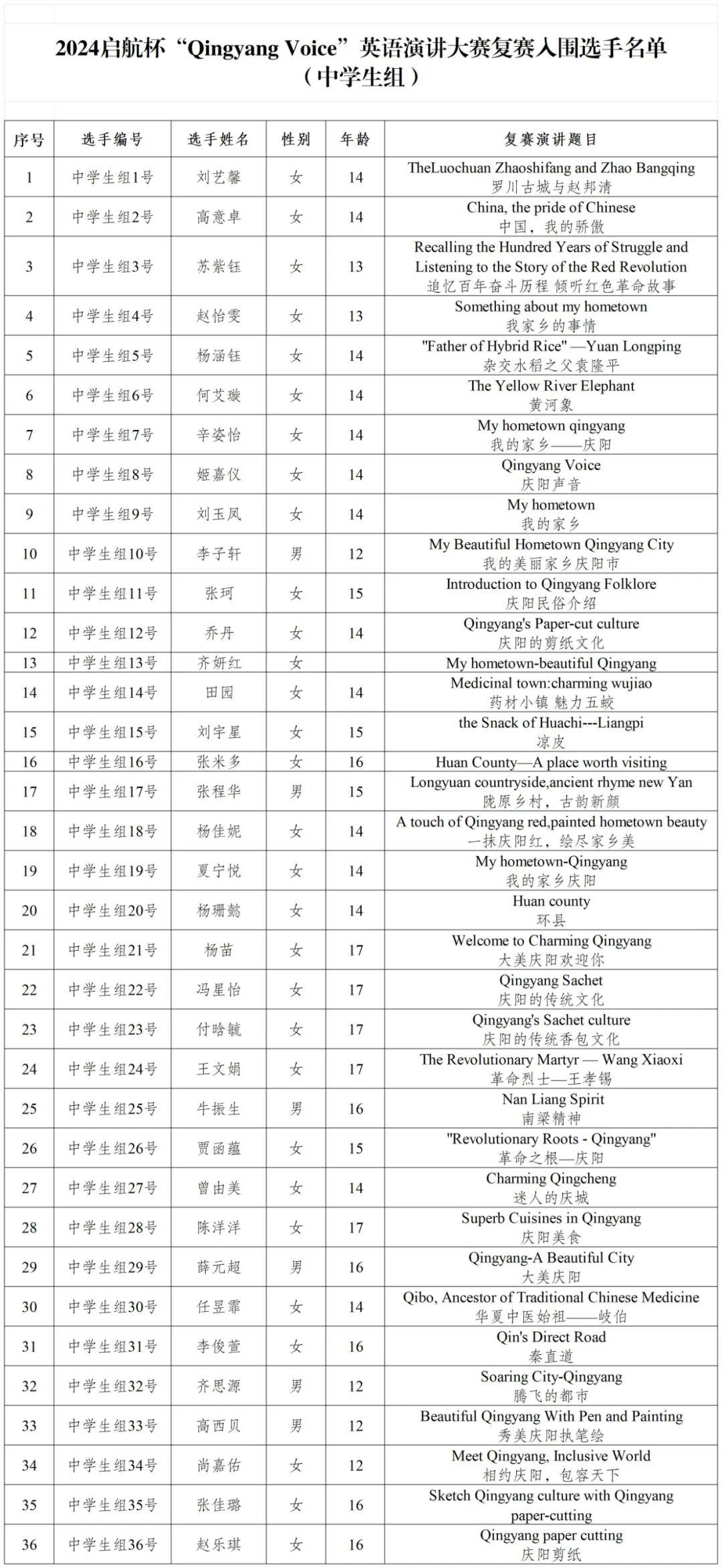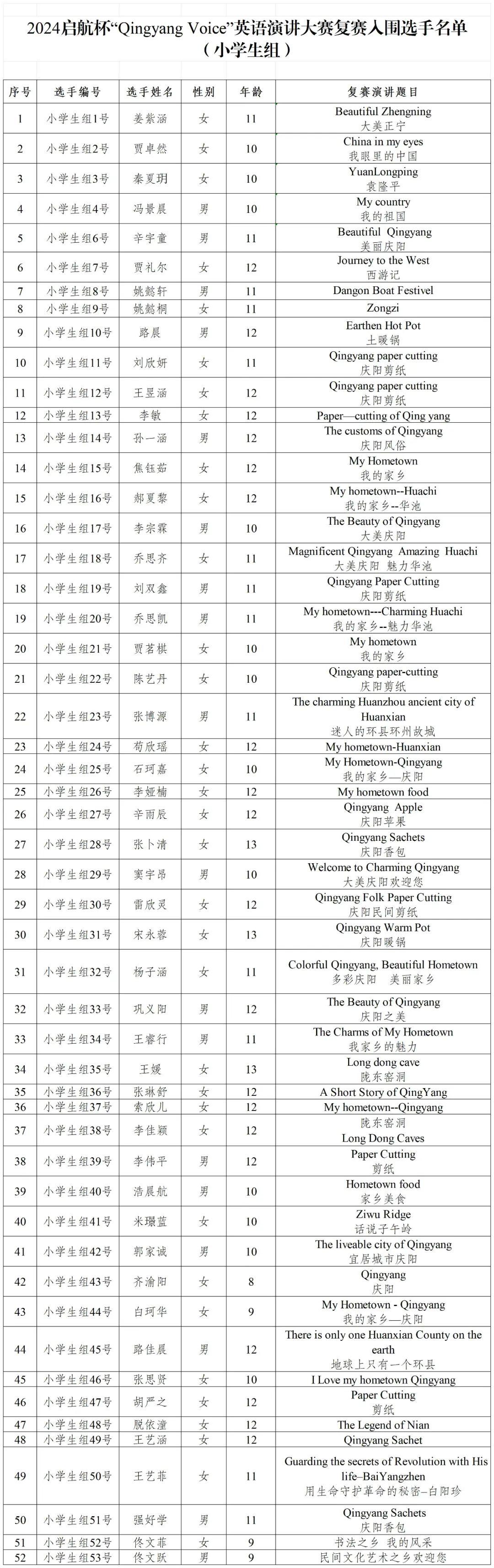 2024’啟航杯“Qingyang Voice”英語演講大賽于2024年4月正式啟動,按照大賽公告要求,預賽由各縣(區(qū))人民政府外事辦公室、市內(nèi)高等院校及企事業(yè)單位自行組織實施,截至6月中旬,各預賽單位已完成預賽選拔和復賽推薦工作。經(jīng)過稿件整理和進一步篩查,共有142名作品符合要求,入圍復賽,其中小學生組52名,中學生組36名,成人組54名,現(xiàn)將通過預賽,進入復賽階段的參賽選手名單公告如下。