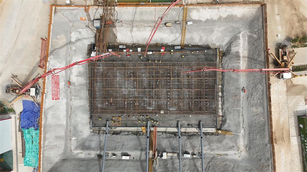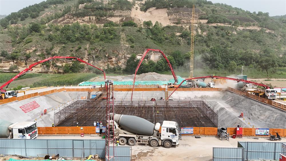 據(jù)現(xiàn)場(chǎng)負(fù)責(zé)人介紹,施工作業(yè)區(qū)位于河谷谷底內(nèi),作業(yè)環(huán)境受限,且混凝土澆筑體積大、時(shí)間長(zhǎng),需控制混凝土水化熱升溫,保證混凝土結(jié)構(gòu)質(zhì)量。項(xiàng)目團(tuán)隊(duì)采用四臺(tái)溜槽搭配三臺(tái)汽車(chē)泵,將混凝土精準(zhǔn)地輸送到位。在澆筑過(guò)程中,項(xiàng)目參建人員全程盯控,嚴(yán)格控制分層厚度及每道工序質(zhì)量,克服重重困難,全力確保承臺(tái)順利澆筑。