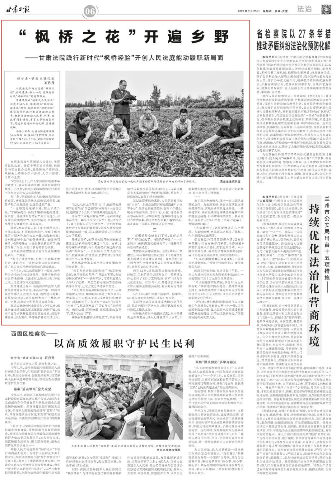 甘肅法院以“楓橋式人民法庭”創(chuàng)建為切入點(diǎn),牢固樹立“抓前端、治未病”理念,把新時(shí)代“楓橋經(jīng)驗(yàn)”落實(shí)到審判執(zhí)行和訴源治理工作中,把訴源治理融入民事、刑事、行政審判各領(lǐng)域,貫穿立審執(zhí)破各環(huán)節(jié),促進(jìn)矛盾糾紛源頭化解、實(shí)質(zhì)性化解。