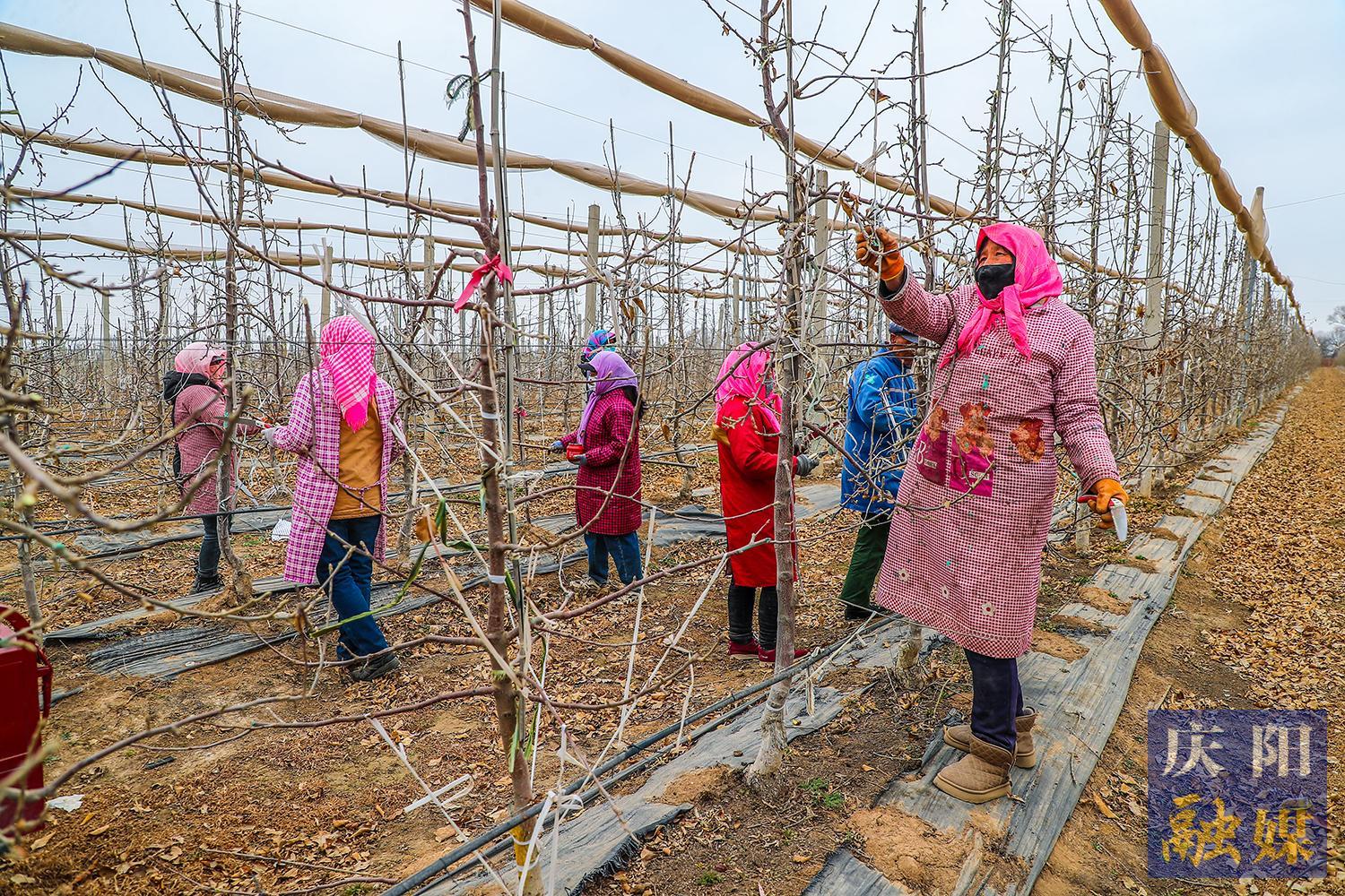 2024年3月15日,鎮(zhèn)原縣慶陽居立農(nóng)業(yè)發(fā)展有限公司示范基地內(nèi),果農(nóng)進行枝條修剪。