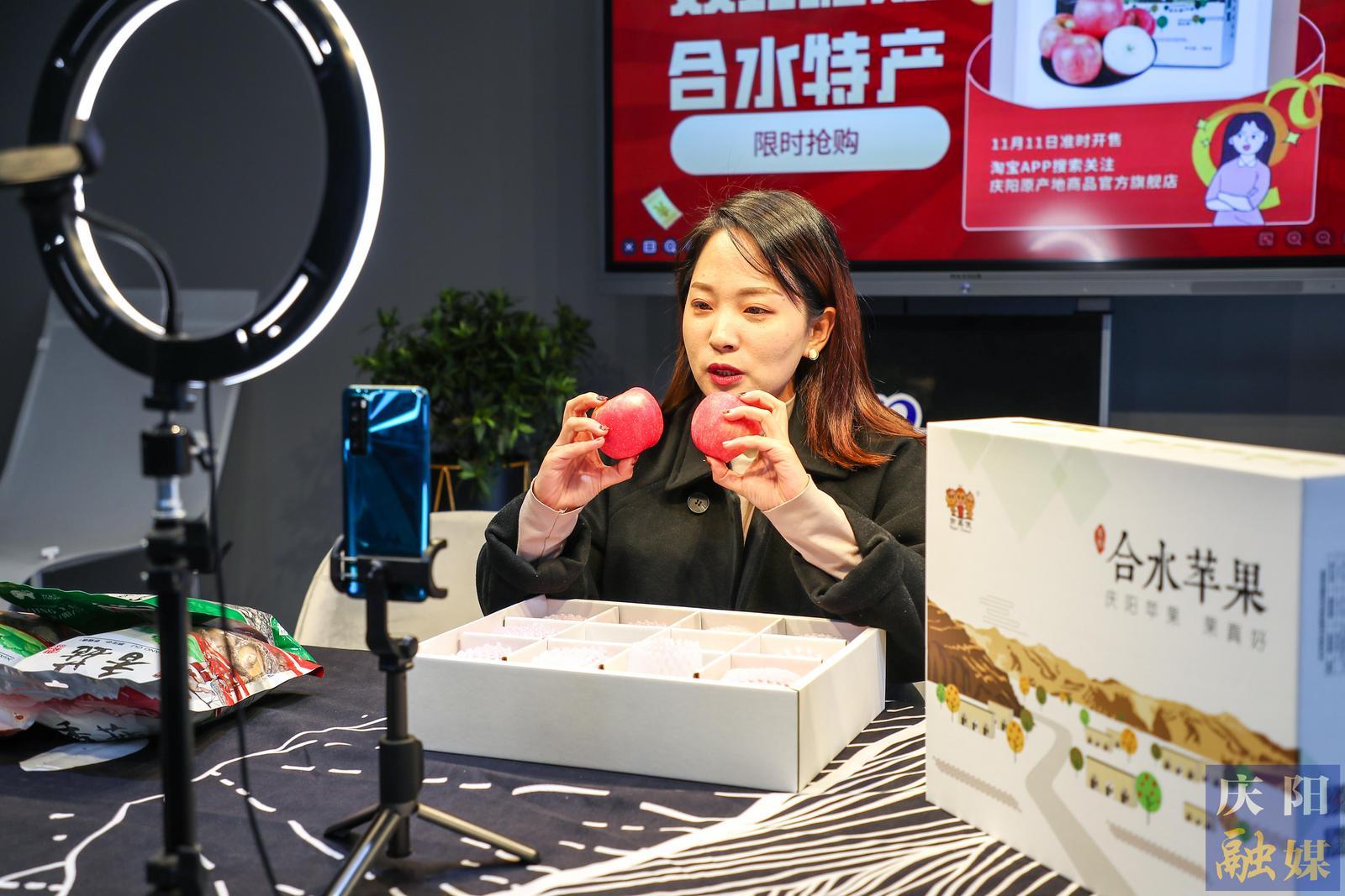 2022年11月6日,合水縣電商孵化園內(nèi)內(nèi),主播直播銷售蘋果。