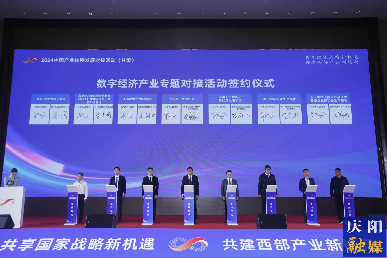 中國信通院黨委副書記王曉麗,省工信廳副廳長黃寶榮,絲綢之路信息港股份有限公司黨委副書記、總經(jīng)理趙四輩,中國能建西北區(qū)域總部黨委書記、總經(jīng)理徐剛,甘肅政法大學(xué)黨委常委、紀(jì)委書記焦愛勝等出席。慶陽市委常委、常務(wù)副市長劉長發(fā)主持活動,副市長張平宗代表慶陽市政府與企業(yè)簽約,現(xiàn)場簽約項目14個、簽約額111.45億元。在當(dāng)天上午舉行2024中國產(chǎn)業(yè)轉(zhuǎn)移發(fā)展對接活動(甘肅)開幕式上,慶陽市還現(xiàn)場簽約項目2個,簽約額611億元。