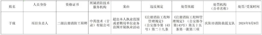 為深入貫徹落實(shí)《中華人民共和國消防法》《社會消防技術(shù)服務(wù)管理規(guī)定》(應(yīng)急管理部令第7號),進(jìn)一步加強(qiáng)對消防技術(shù)服務(wù)機(jī)構(gòu)的事前引導(dǎo)、事中事后監(jiān)管,推動消防技術(shù)服務(wù)機(jī)構(gòu)嚴(yán)格依法依規(guī)執(zhí)業(yè),慶陽市消防救援支隊(duì)按照《慶陽市2024年消防技術(shù)服務(wù)機(jī)構(gòu)和消防職業(yè)資格證書專項(xiàng)檢查工作方案》要求開展了專項(xiàng)檢查,并對發(fā)現(xiàn)存在違法行為的消防技術(shù)服務(wù)機(jī)構(gòu)依法進(jìn)行了查處?,F(xiàn)將受到行政處罰的消防技術(shù)服務(wù)機(jī)構(gòu)曝光如下: