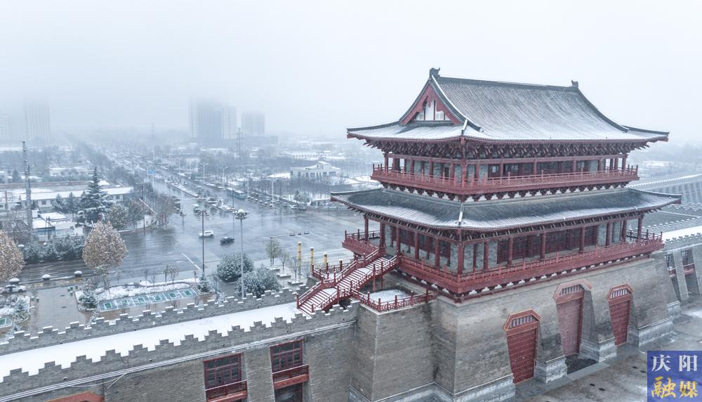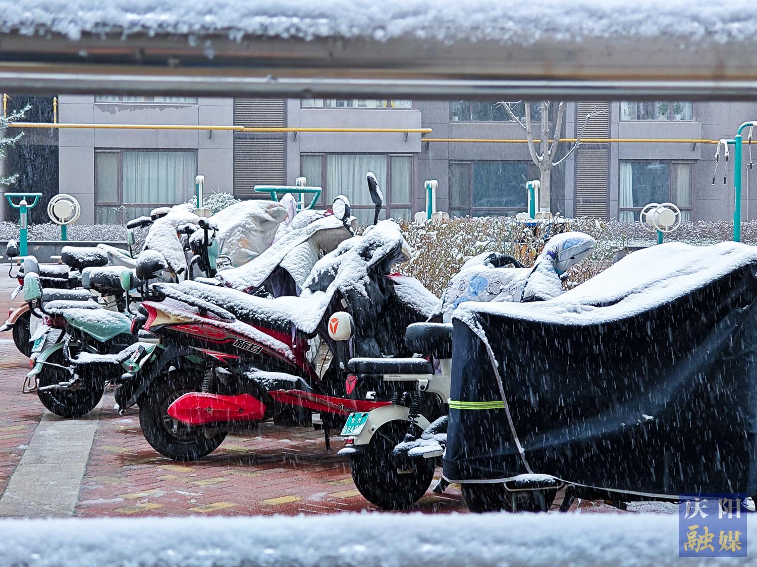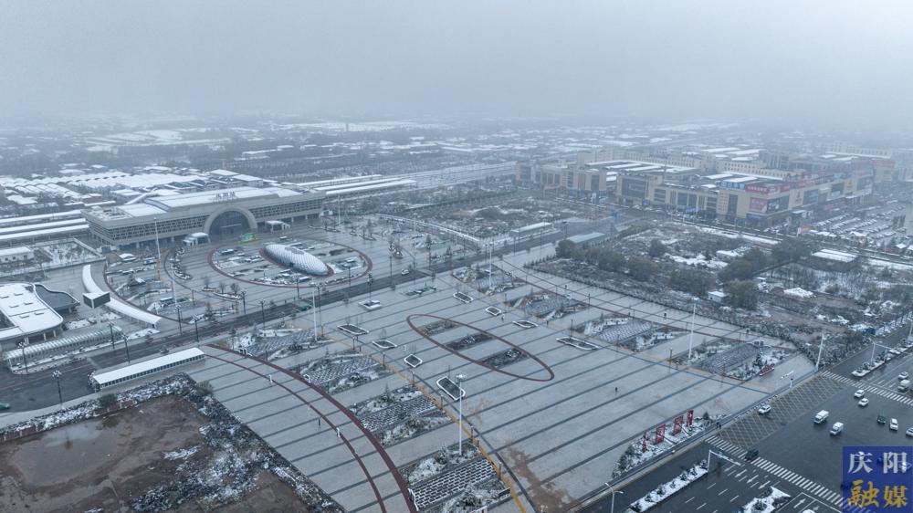 西峰區(qū)北京大道兩側(cè)綠植被積雪覆蓋。
