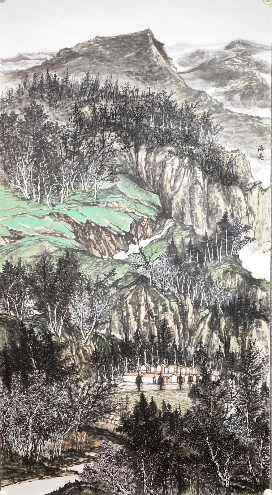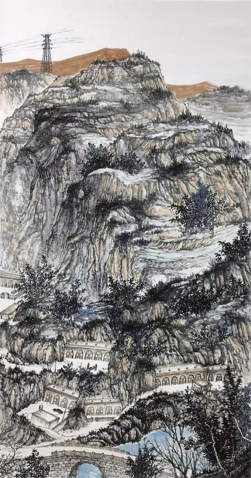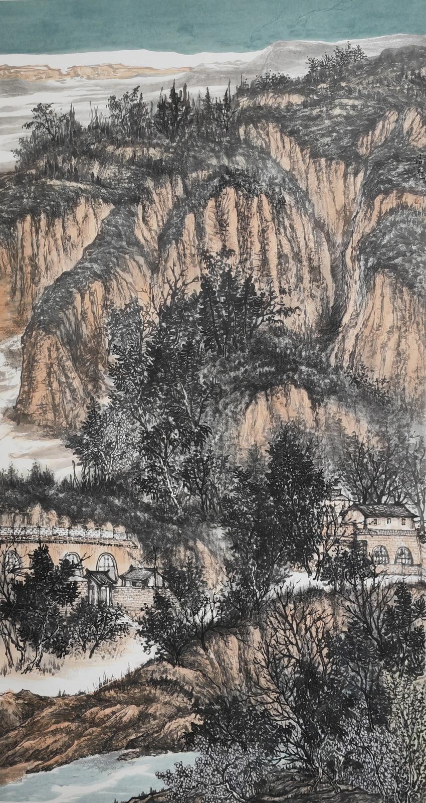 山水畫的創(chuàng)作,必須用很多時(shí)間直面客觀的山川景物,眼中之所見,心中之所悟,手中之所繪,將復(fù)雜之形體進(jìn)行主觀歸納,伴以情感、興趣、感受、想象等因素作用,才能創(chuàng)造出反映自己思想境界的作品。浩亮先生深明此理,他平時(shí)非常重視寫生,假日閑暇,驅(qū)車穿行于黃土高原的溝溝峁峁,“行到水窮處,從看云起時(shí)?!毙睦镉辛它c(diǎn)意思,便展開畫板,將家鄉(xiāng)的山山水水涂在宣紙上,通過不斷的寫生積累,他創(chuàng)作出了黃土風(fēng)情系列作品,如前面提到的《黃土之戀》《黃土蒼景》《家山新貌》《朝云出岫》等,這些作品不僅描繪出了隴東黃土高原的地貌特征,而且用心體悟,把現(xiàn)代元素、風(fēng)土人情、人文情懷、家園之戀楔入其中,作品便有了鮮活了生命力和強(qiáng)烈的感染力。
