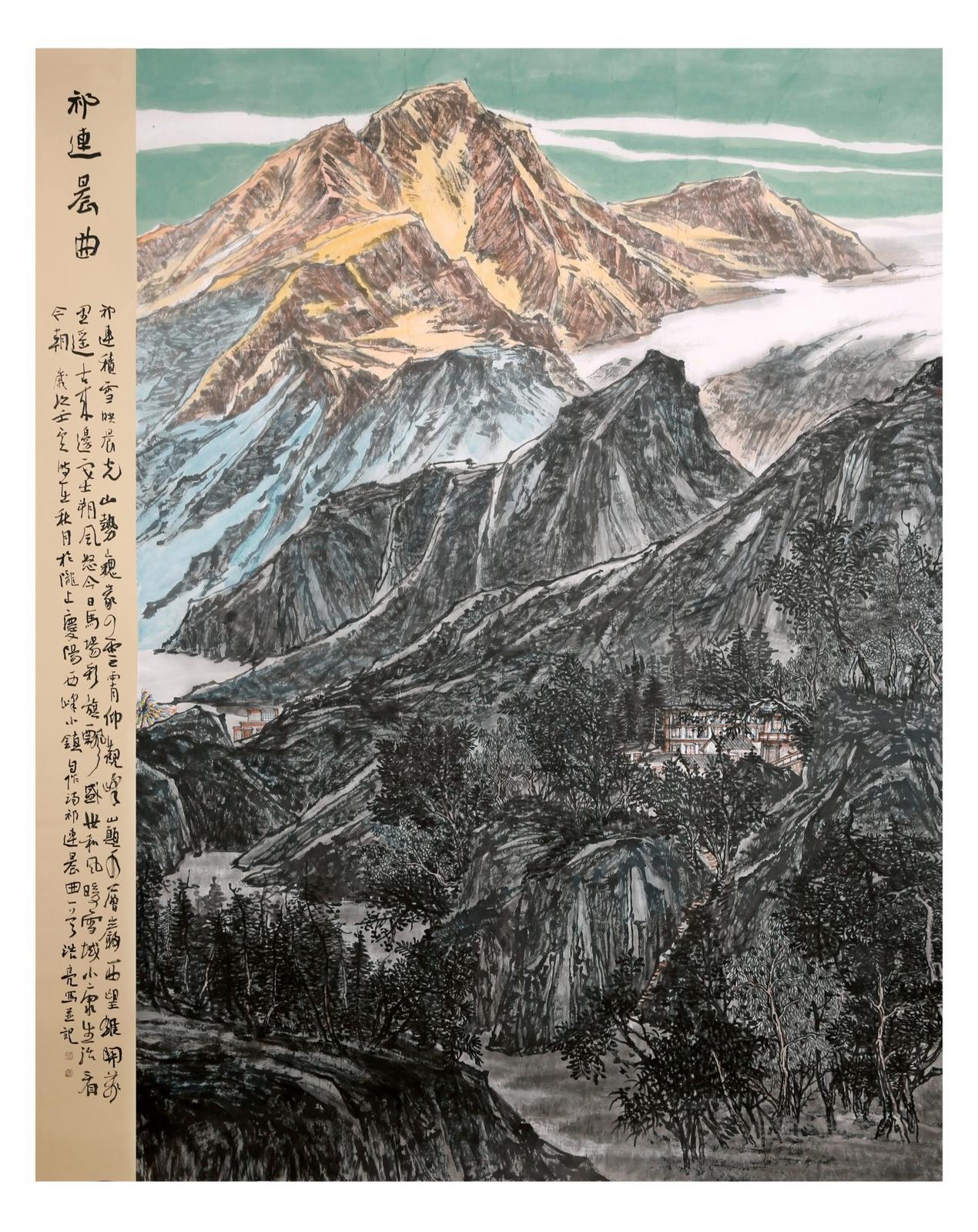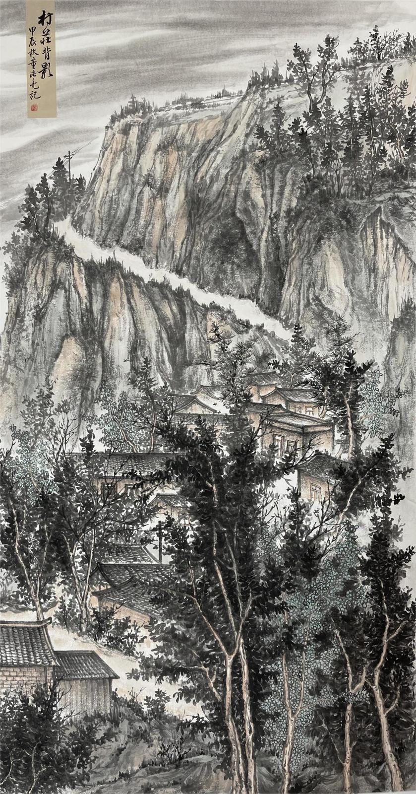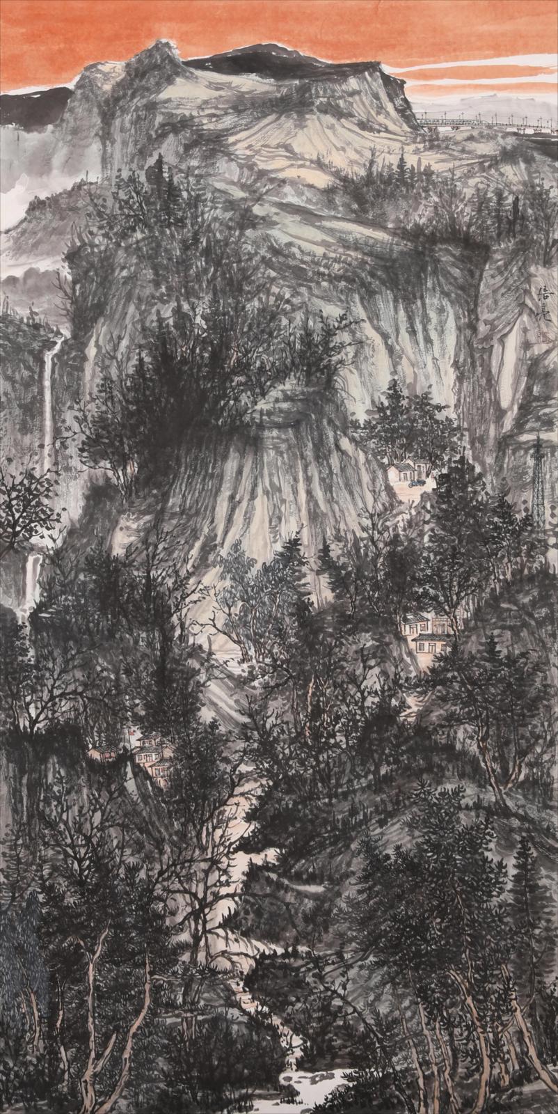 山水畫的創(chuàng)作,必須用很多時(shí)間直面客觀的山川景物,眼中之所見,心中之所悟,手中之所繪,將復(fù)雜之形體進(jìn)行主觀歸納,伴以情感、興趣、感受、想象等因素作用,才能創(chuàng)造出反映自己思想境界的作品。浩亮先生深明此理,他平時(shí)非常重視寫生,假日閑暇,驅(qū)車穿行于黃土高原的溝溝峁峁,“行到水窮處,從看云起時(shí)?!毙睦镉辛它c(diǎn)意思,便展開畫板,將家鄉(xiāng)的山山水水涂在宣紙上,通過不斷的寫生積累,他創(chuàng)作出了黃土風(fēng)情系列作品,如前面提到的《黃土之戀》《黃土蒼景》《家山新貌》《朝云出岫》等,這些作品不僅描繪出了隴東黃土高原的地貌特征,而且用心體悟,把現(xiàn)代元素、風(fēng)土人情、人文情懷、家園之戀楔入其中,作品便有了鮮活了生命力和強(qiáng)烈的感染力。