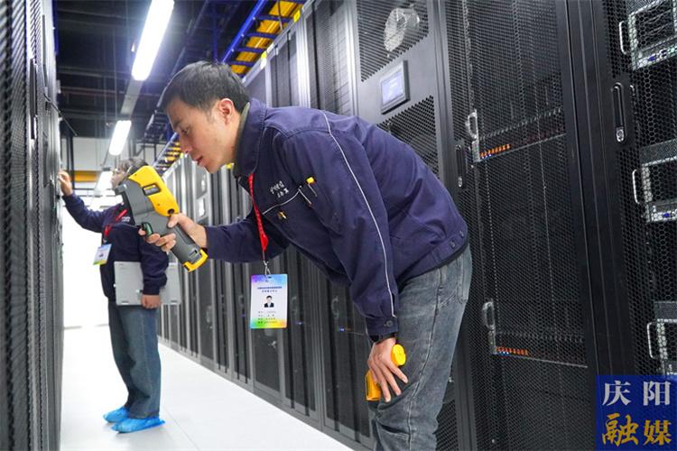 中國電信慶陽算力中心機房內,工作人員檢查上架服務器溫度。
