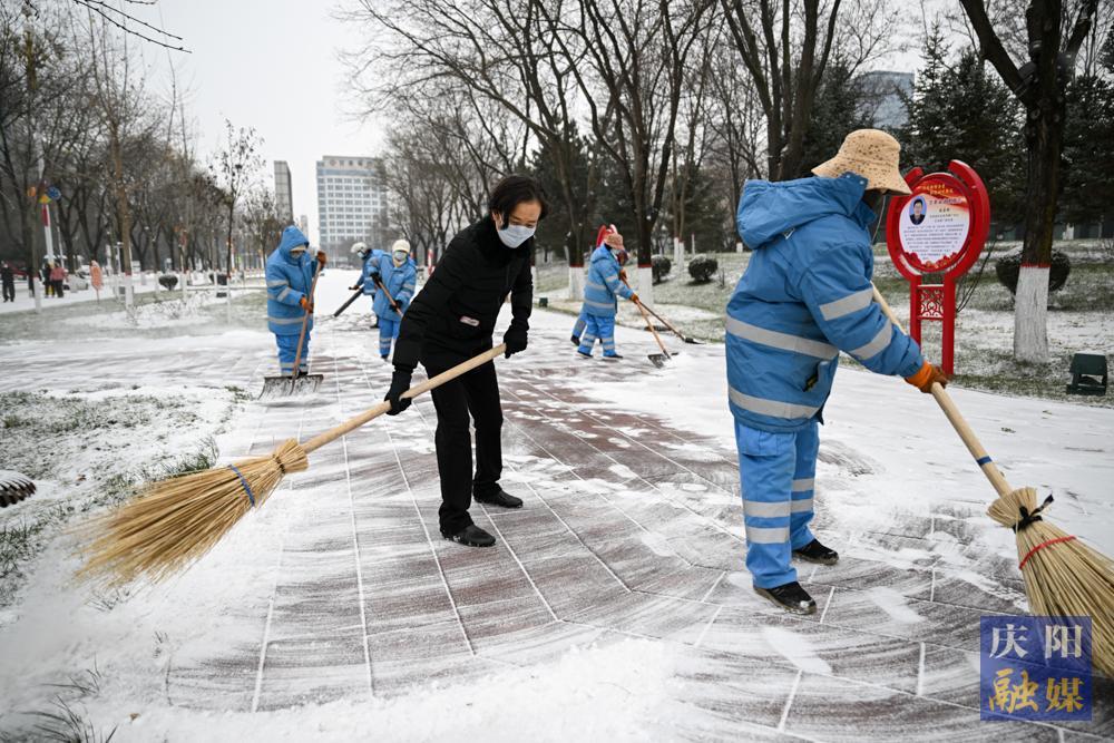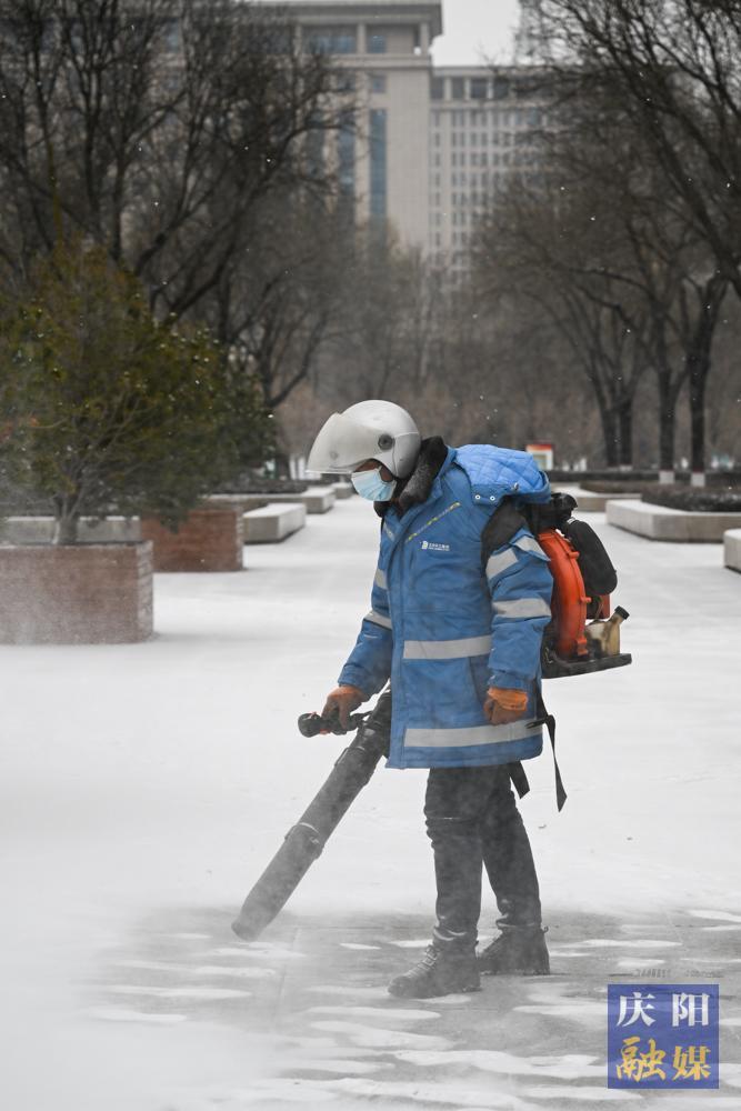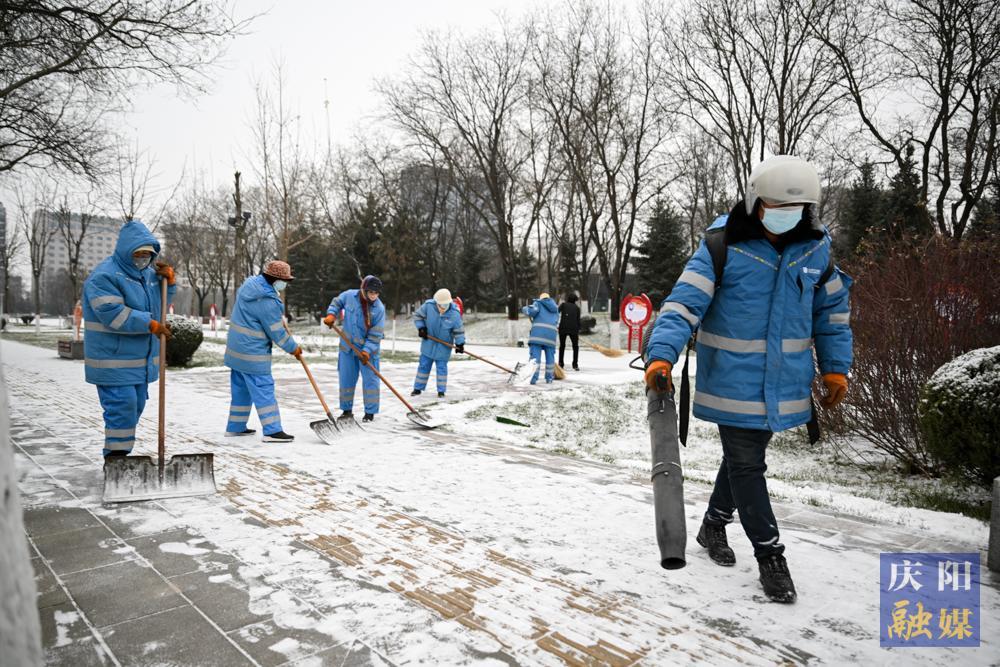 西峰區(qū)和諧廣場(chǎng),環(huán)衛(wèi)工人鏟雪除冰。