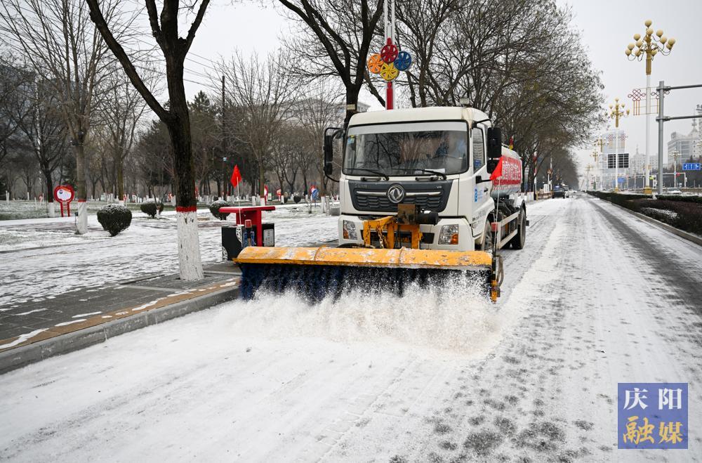 西峰區(qū)岐黃大道,清雪車輛融雪除冰,保障道路通暢。