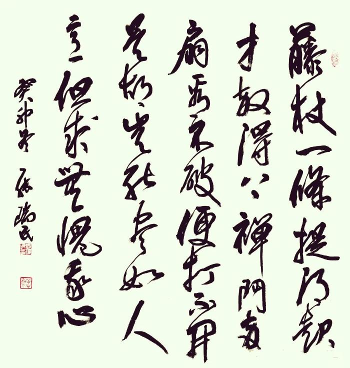 它拒絕重復(fù)和平庸。顯然,瑞民書法從線條的質(zhì)量、留白、空間結(jié)構(gòu)的疏密、奇正等關(guān)系的處理上,有了不少突破,不僅好看,而且耐看,有嚼頭。