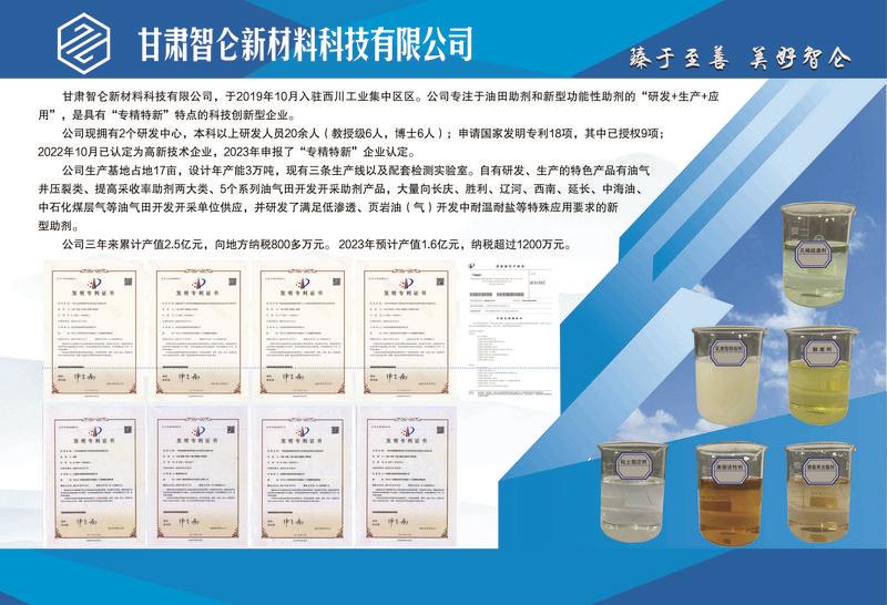 甘肅智侖新材料科技有限公司成立于2019年10月,注冊資金2000萬元,是一家專注于油田助劑和新型功能型助劑“研發(fā)+生產(chǎn)+應用”的科技創(chuàng)新型企業(yè)。建成了年產(chǎn)8000噸油田助劑生產(chǎn)線3條及檢測實驗室1個,企業(yè)擁有2個研發(fā)中心,研發(fā)人員20余人。累計產(chǎn)值3.8億元,累計納稅2200萬元。
