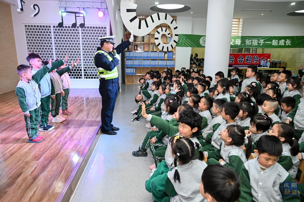 西峰區(qū)博苑陽光幼兒園,交警為小朋友們講解交通安全知識(shí)。