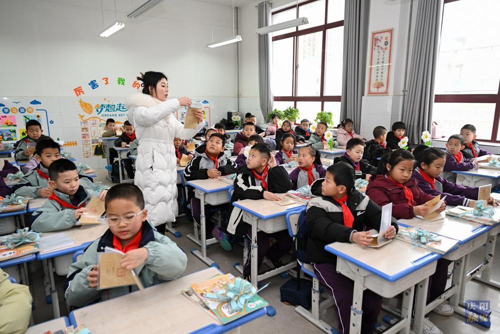 西峰區(qū)董志鎮(zhèn)周嶺小學(xué),學(xué)生們領(lǐng)到了新書本。