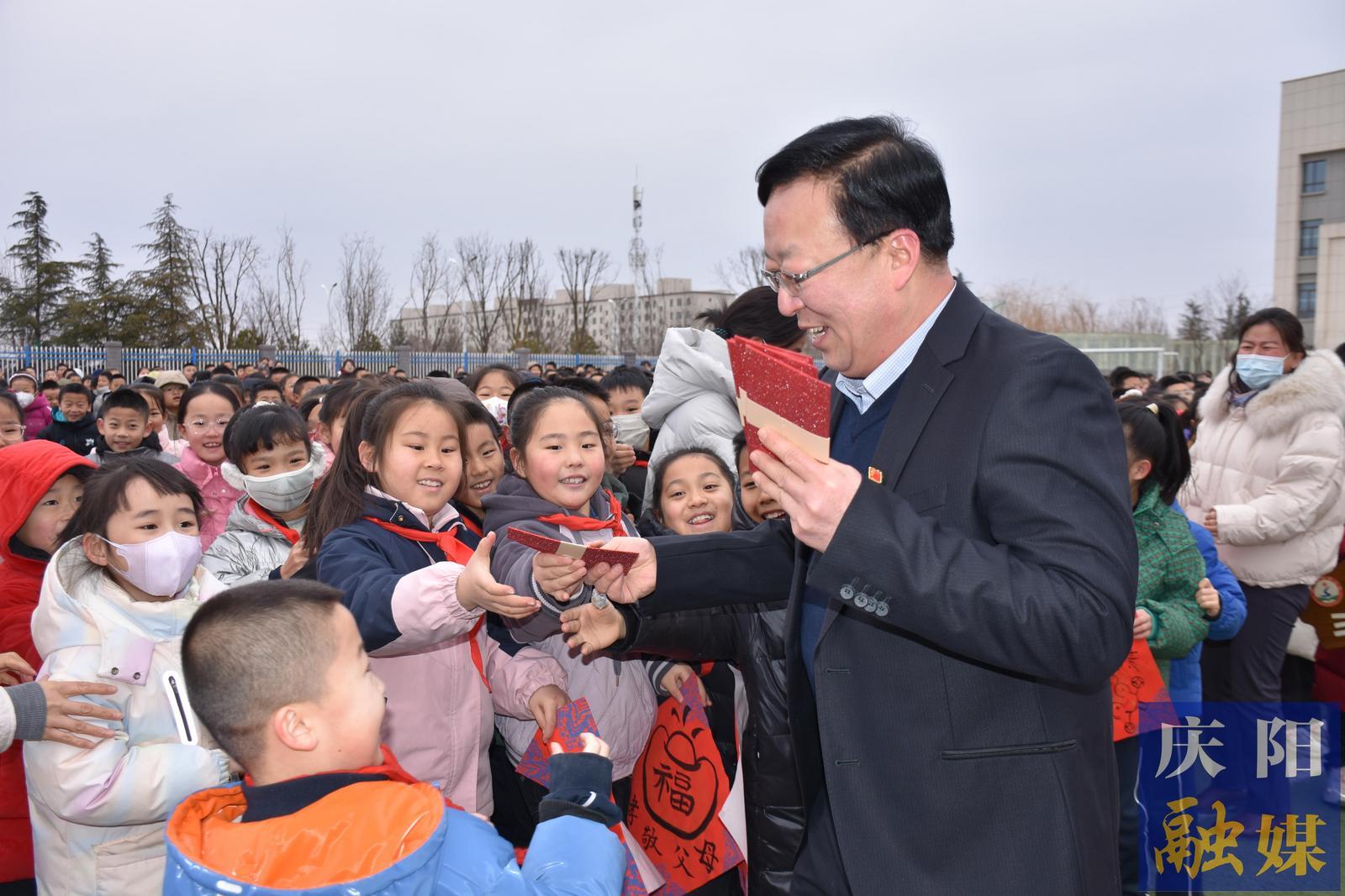 慶陽市實驗小學(xué)校長孫海東以“燃內(nèi)心斗志 做‘美德學(xué)生’”為主題寄語學(xué)子:順境持謙遜之姿,逆境守豁達之態(tài);以書香潤澤心靈,以歷練涵養(yǎng)氣度;突破慣性思維,培植終生志趣;善思篤行,勇拓新局,師生同心擘畫美好教育藍圖,共鑄特色育人品牌。
