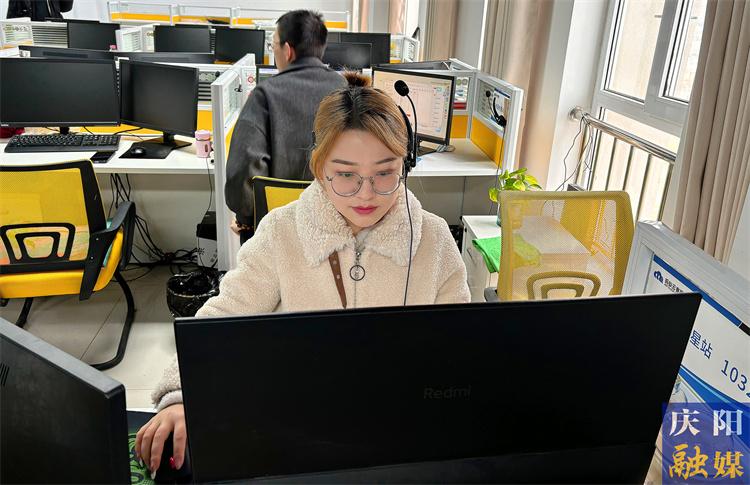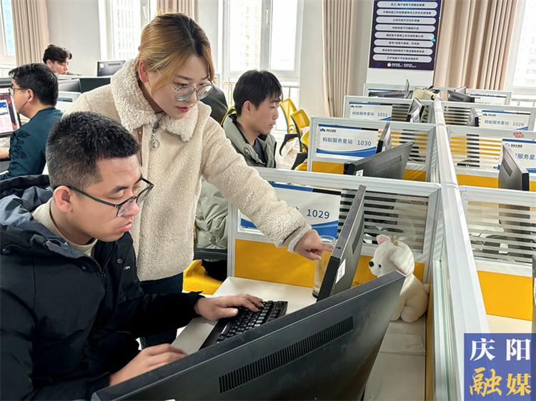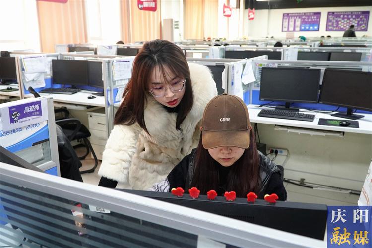 ▲環(huán)縣數(shù)字就業(yè)基地內(nèi),培訓(xùn)師吳文娟指導(dǎo)工作人員開展業(yè)務(wù)。