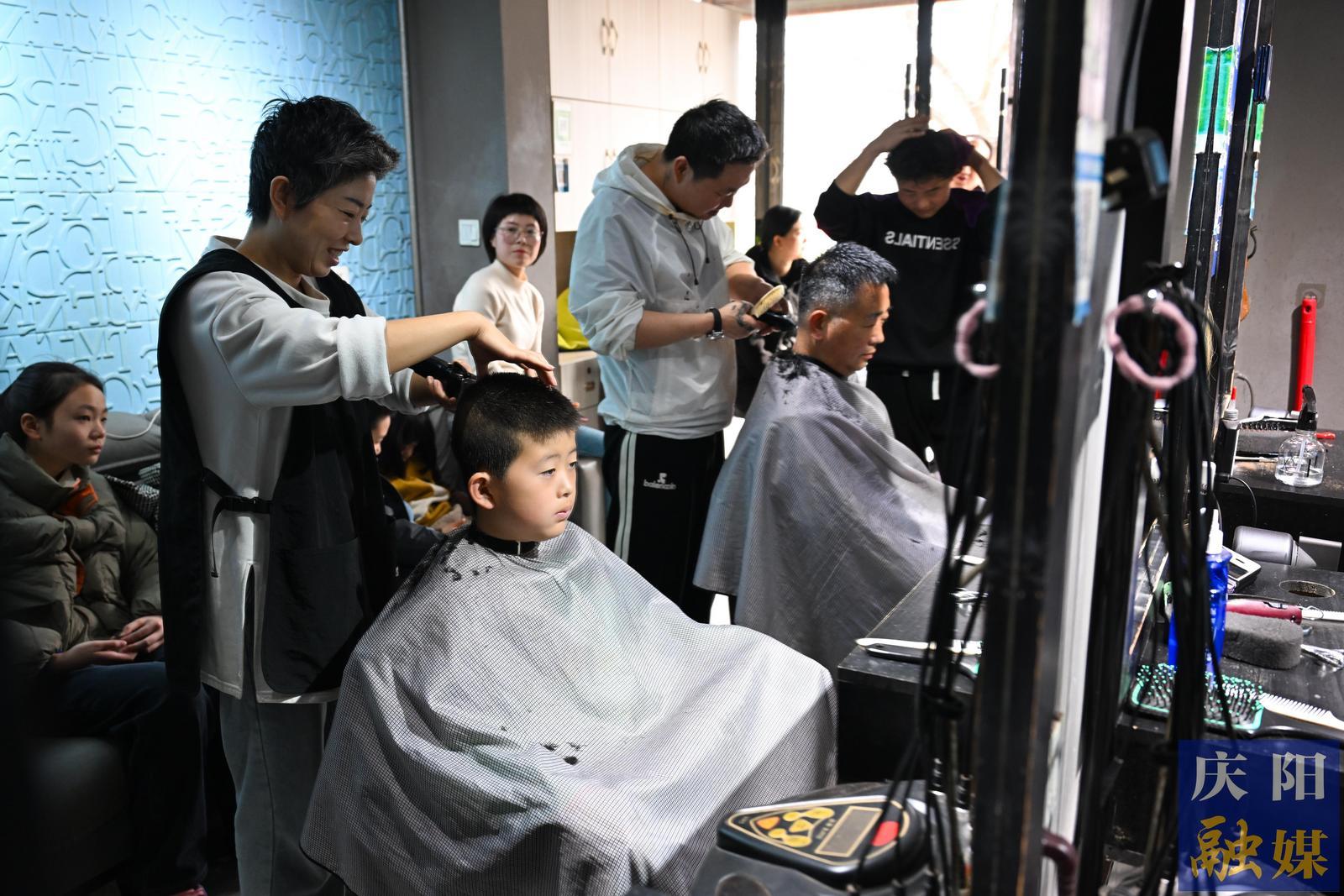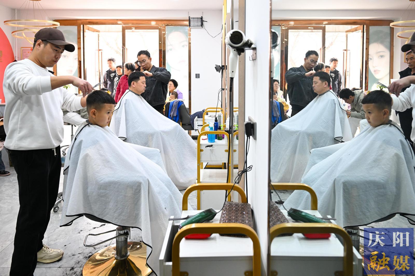 西峰區(qū)大街小巷的理發(fā)館內(nèi)人大孩子排隊“剃龍頭”。