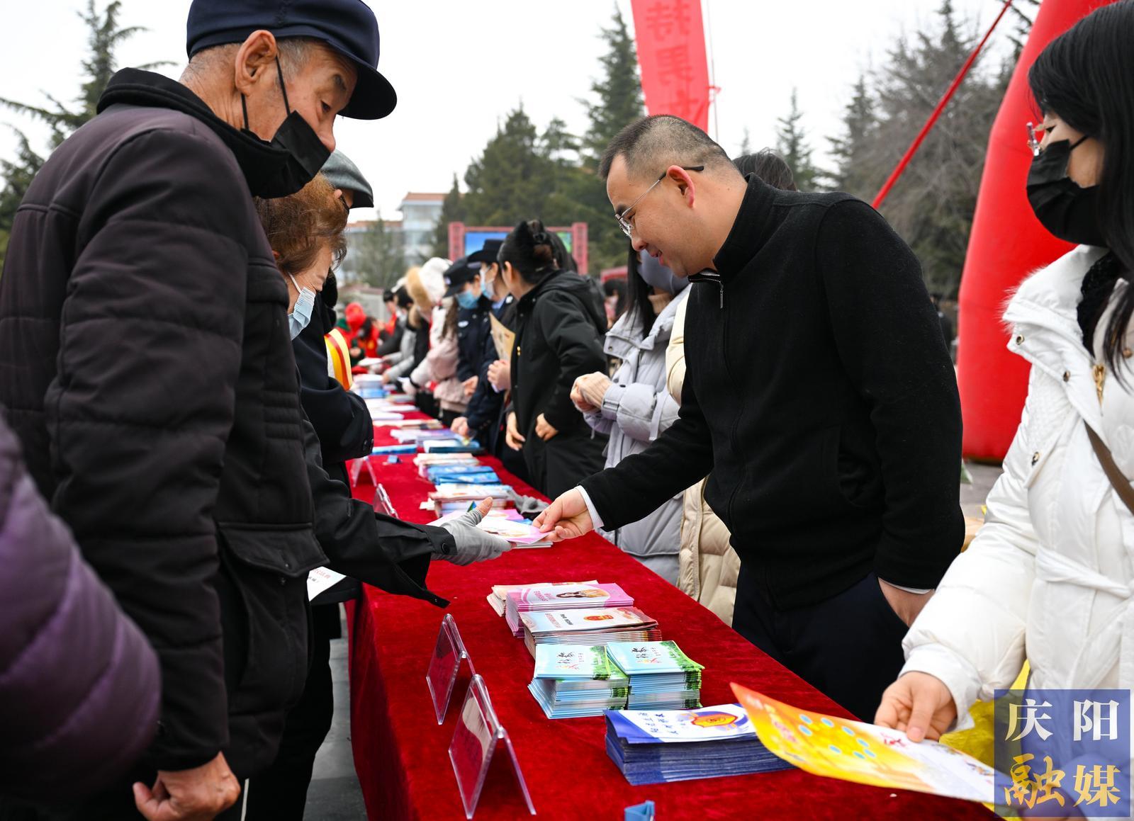 慶陽(yáng)市委政法委工作人員向市民發(fā)放普法宣傳冊(cè)。