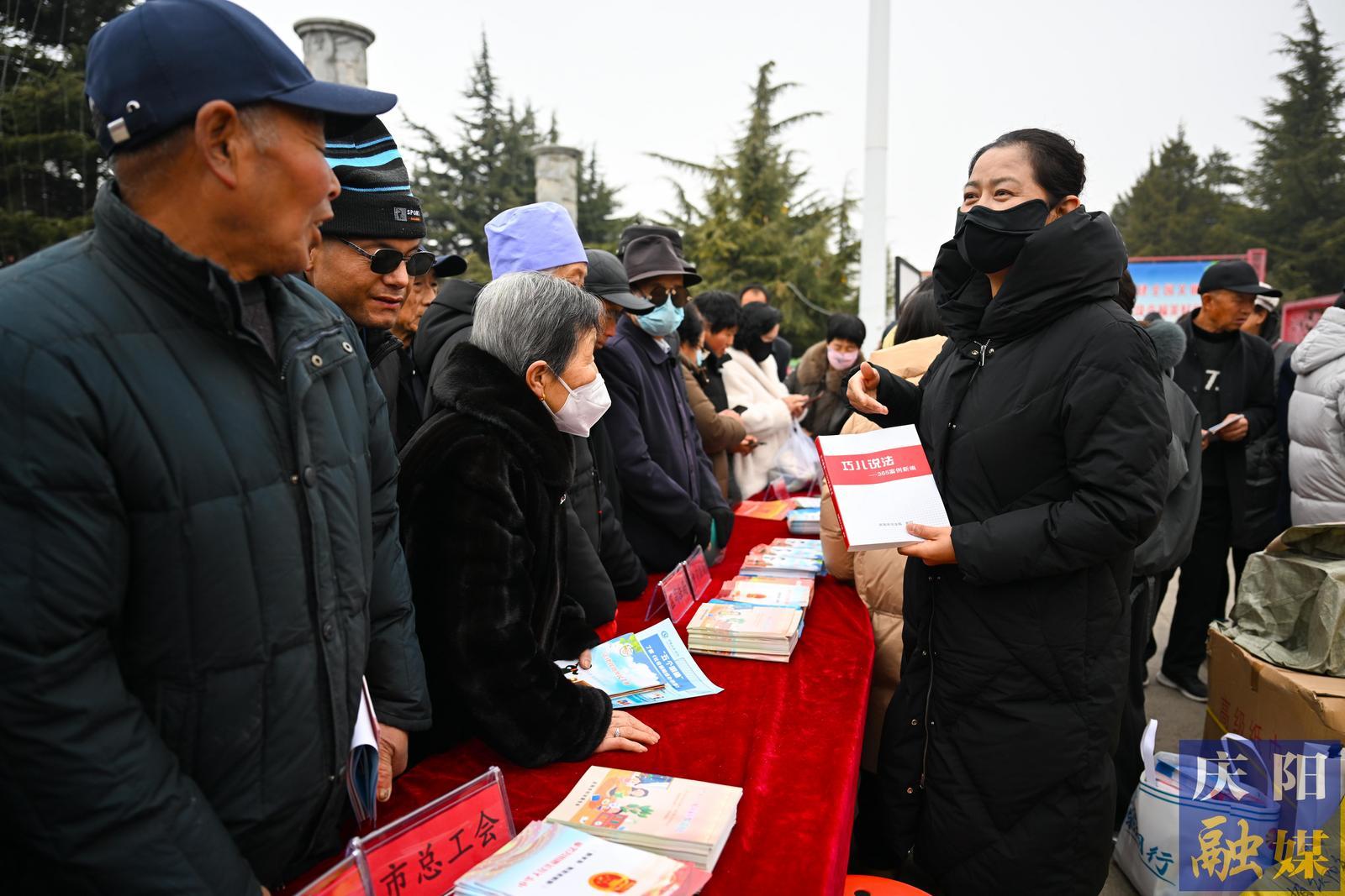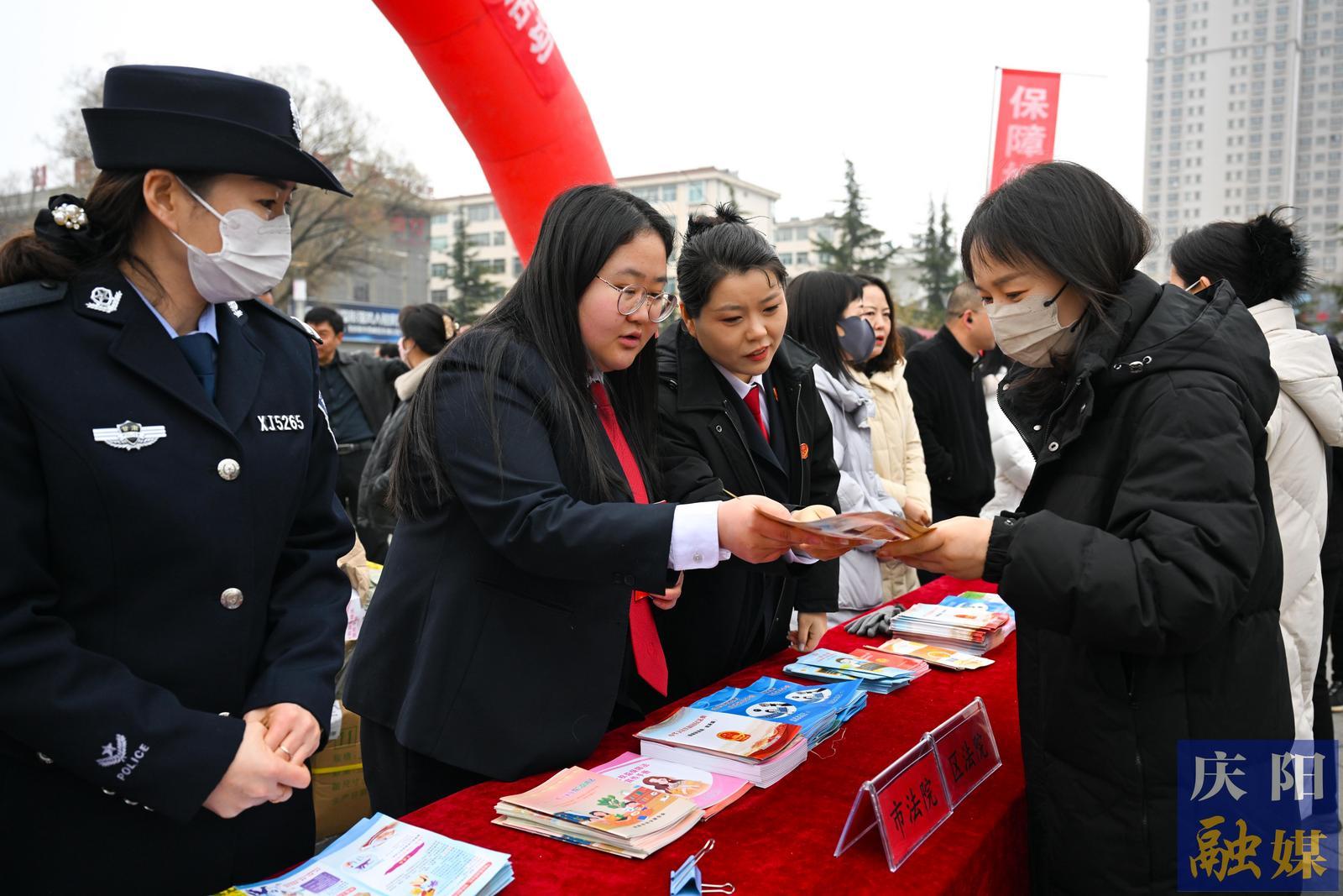 慶陽(yáng)市法院工作人員向市民宣傳《婦女權(quán)益保障法》等法律法規(guī)。