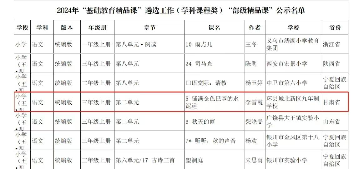 日前,國(guó)家教育部官網(wǎng)公布了2024年“基礎(chǔ)教育精品課”遴選名單,環(huán)縣城北新區(qū)九年制學(xué)校李雪霞老師選送的課例《鋪滿金色巴掌的水泥道》榮獲“部級(jí)精品課”。