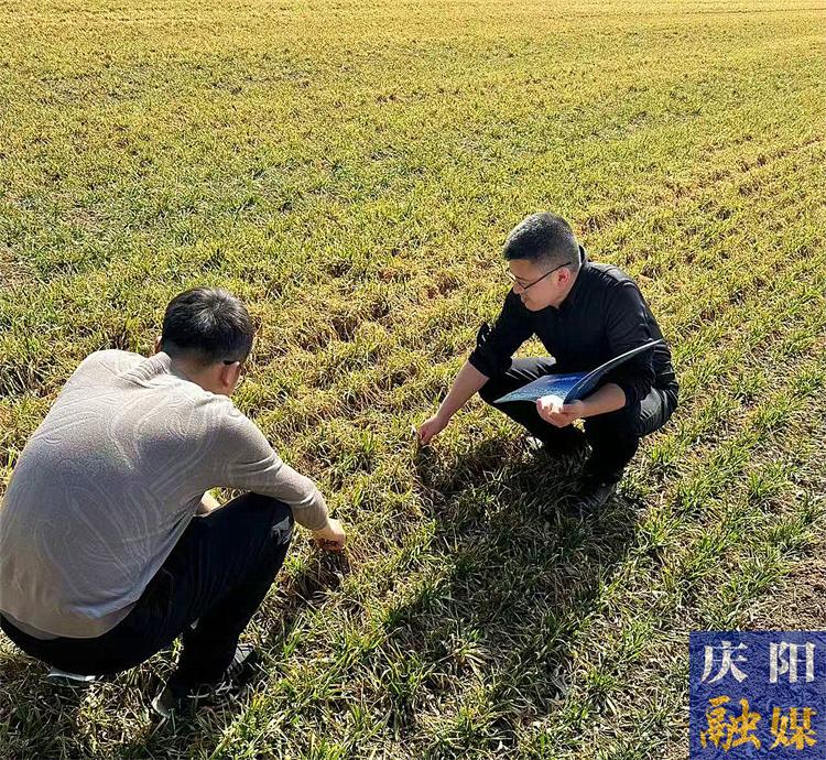 ▲慶陽(yáng)市氣象部門(mén)工作人員進(jìn)行麥田墑情調(diào)查。