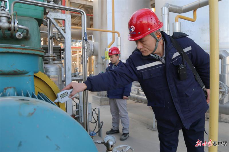 西峰區(qū)天然氣提氦與儲備調(diào)峰企業(yè)工人檢查設(shè)備運行情況。
