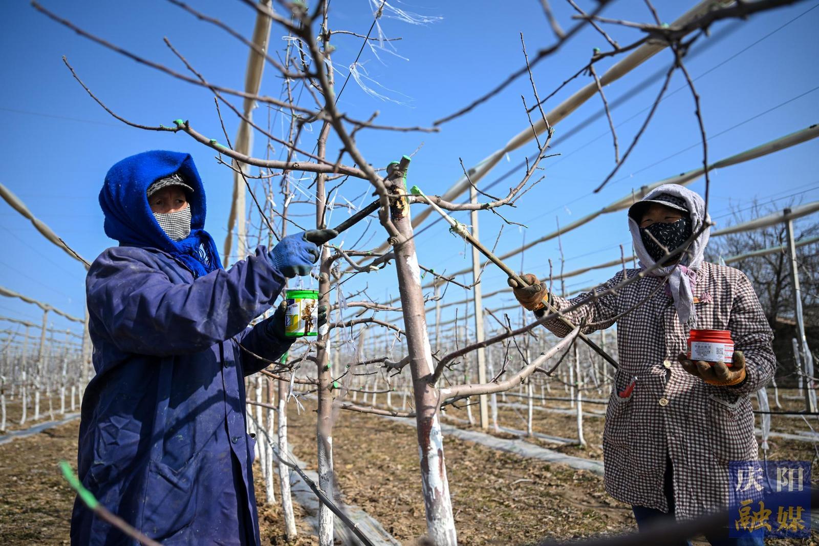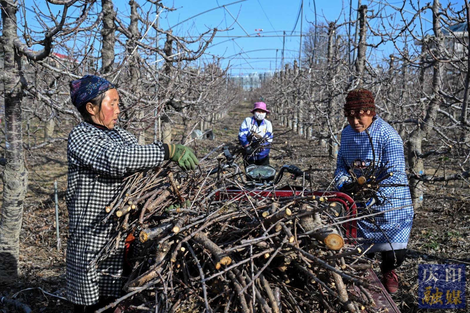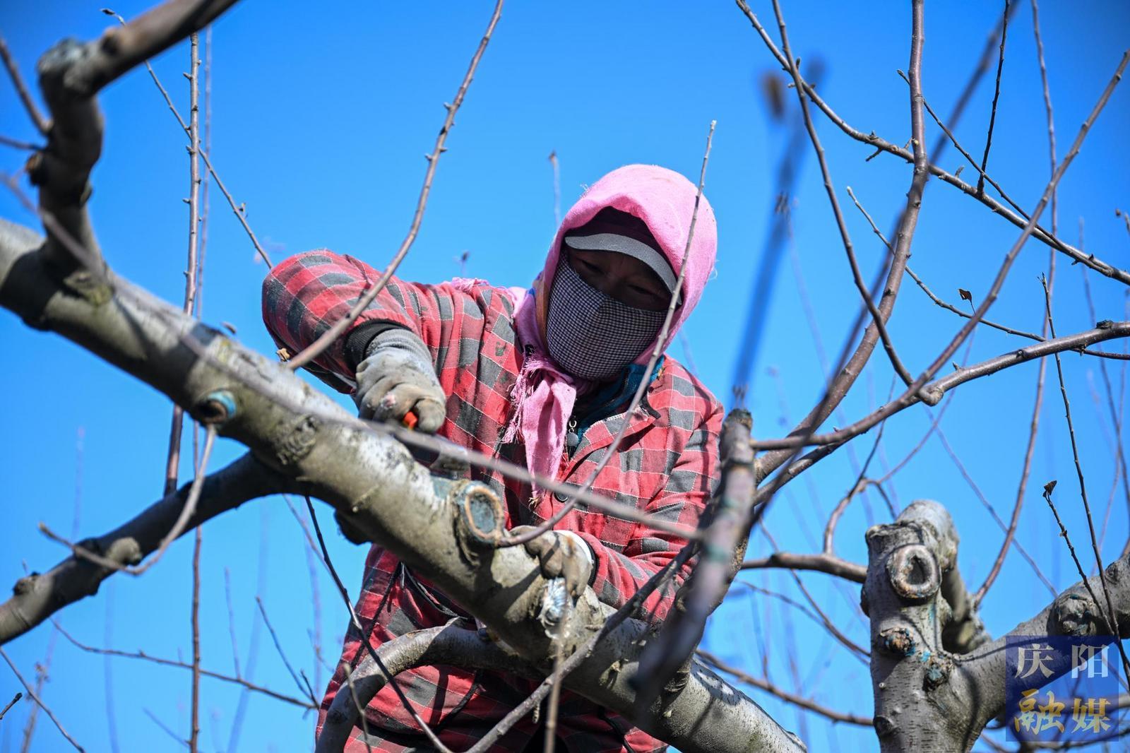 西峰區(qū)溫泉鎮(zhèn)黃官寨村果農(nóng)給蘋果樹剪枝。