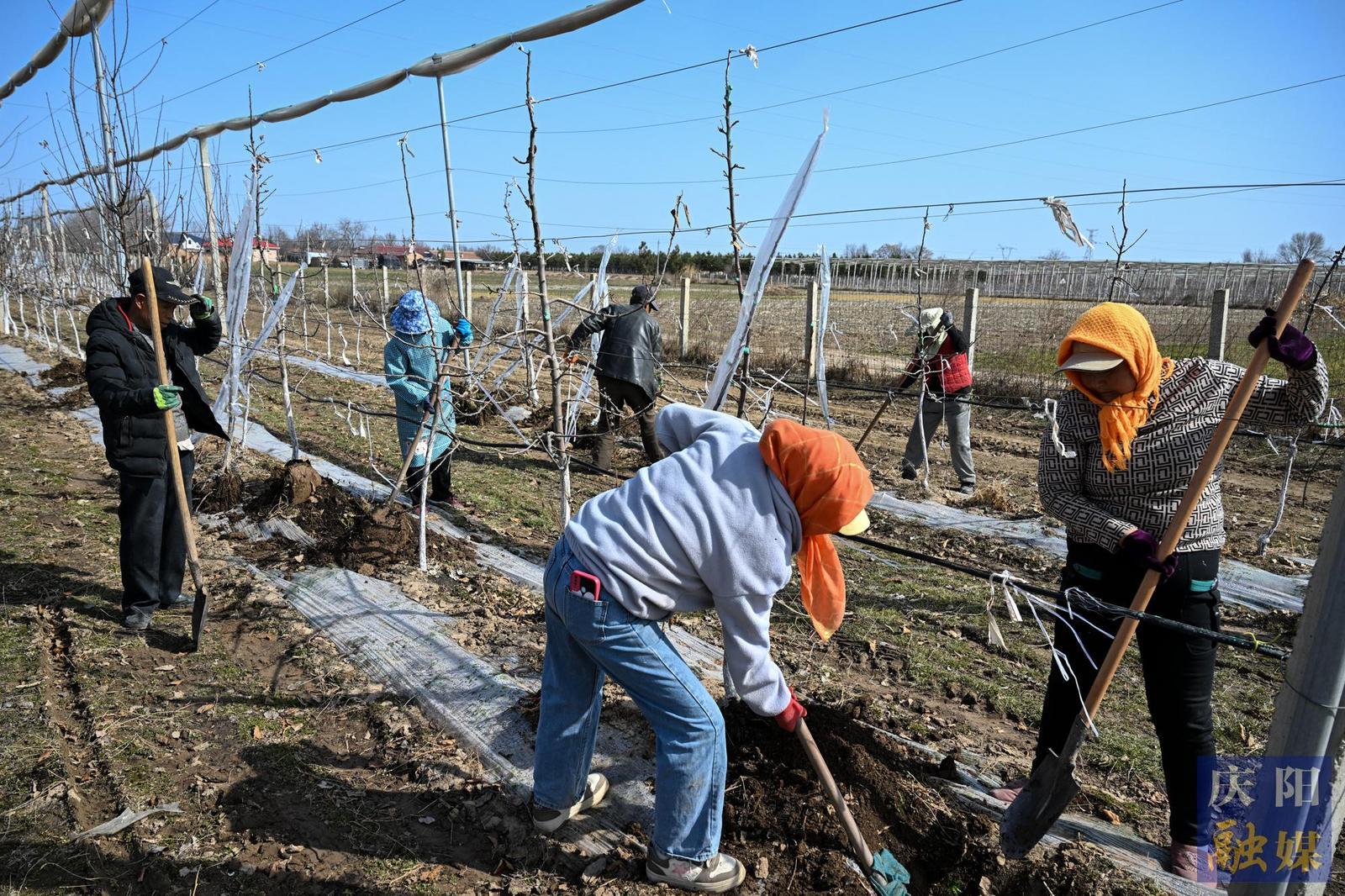 慶陽居立現(xiàn)代化蘋果示范園,工人在移栽蘋果樹。